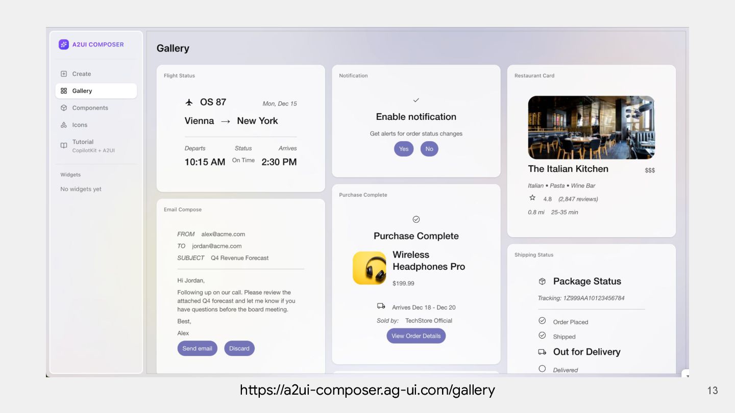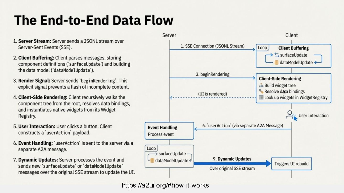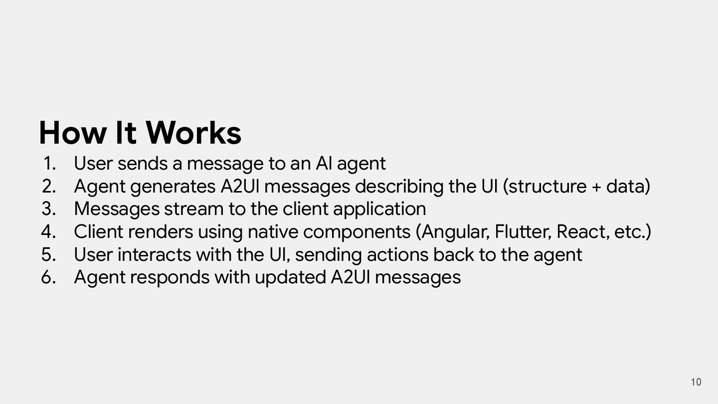 AI agent 2. Agent generates A2UI messages describing the UI (structure + data) 3. Messages stream to the client application 4. Client renders using native components (Angular, Flutter, React, etc.) 5. User interacts with the UI, sending actions back to the agent 6. Agent responds with updated A2UI messages 10