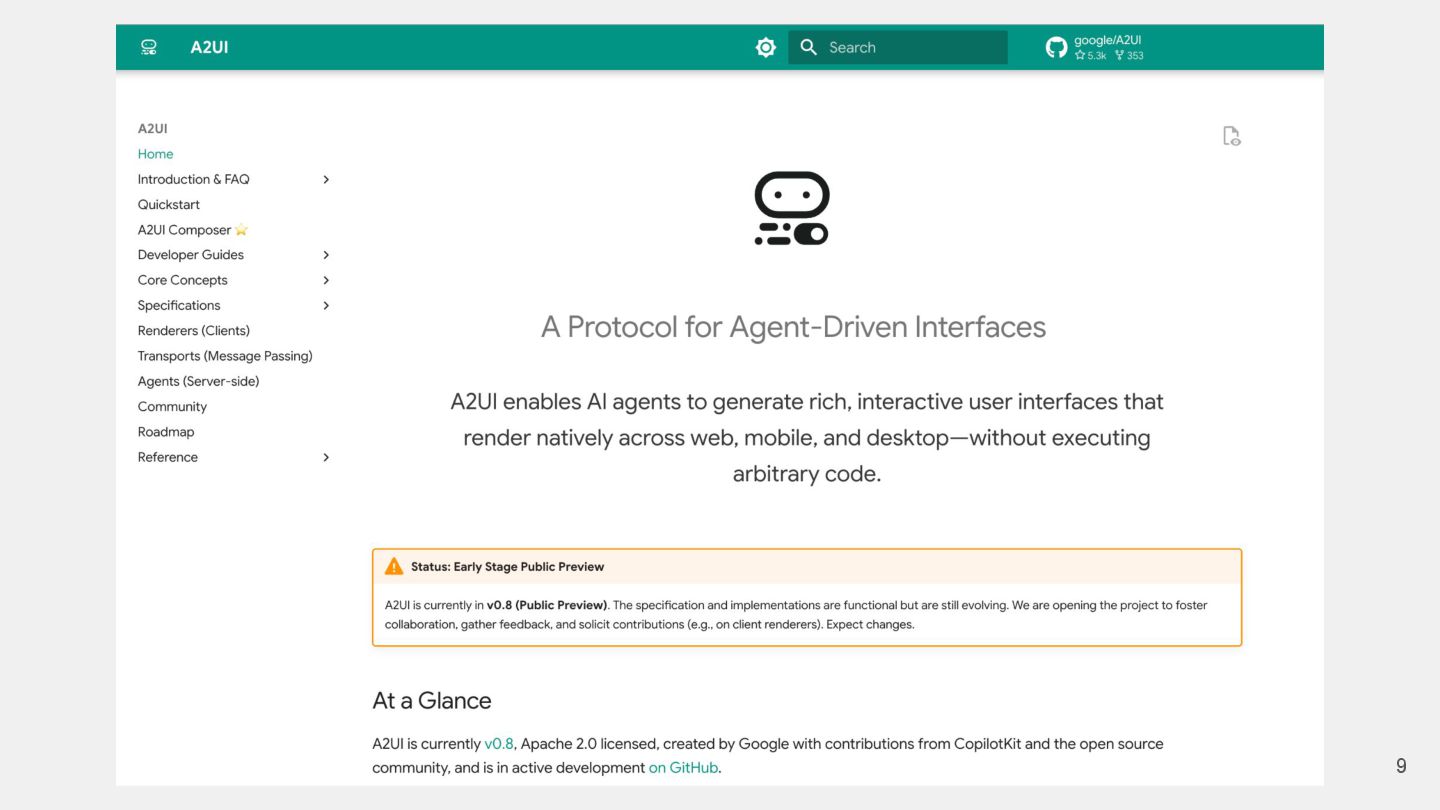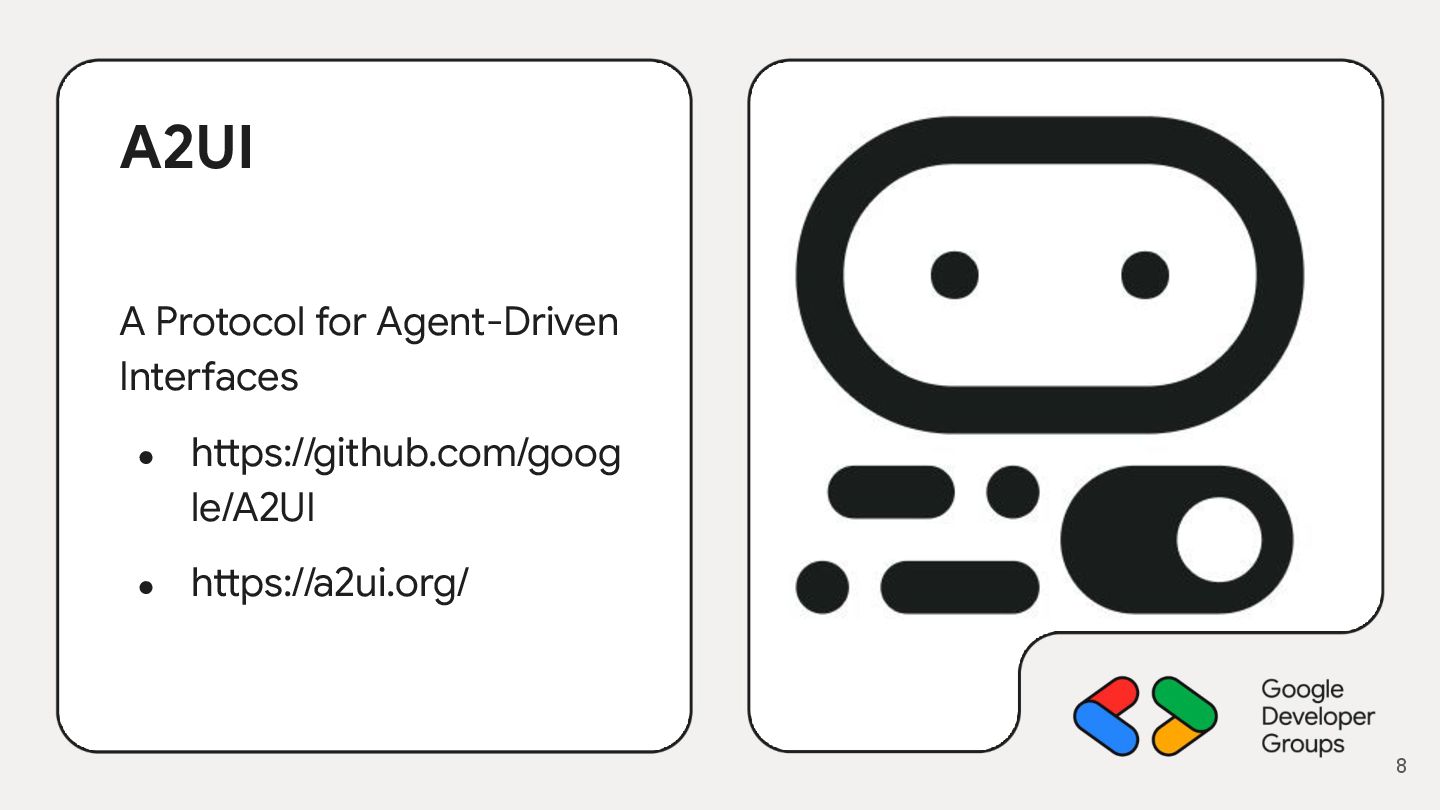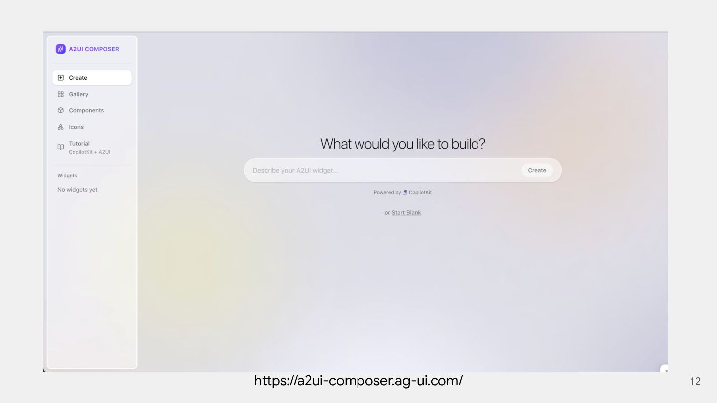 AI agent 2. Agent generates A2UI messages describing the UI (structure + data) 3. Messages stream to the client application 4. Client renders using native components (Angular, Flutter, React, etc.) 5. User interacts with the UI, sending actions back to the agent 6. Agent responds with updated A2UI messages 10