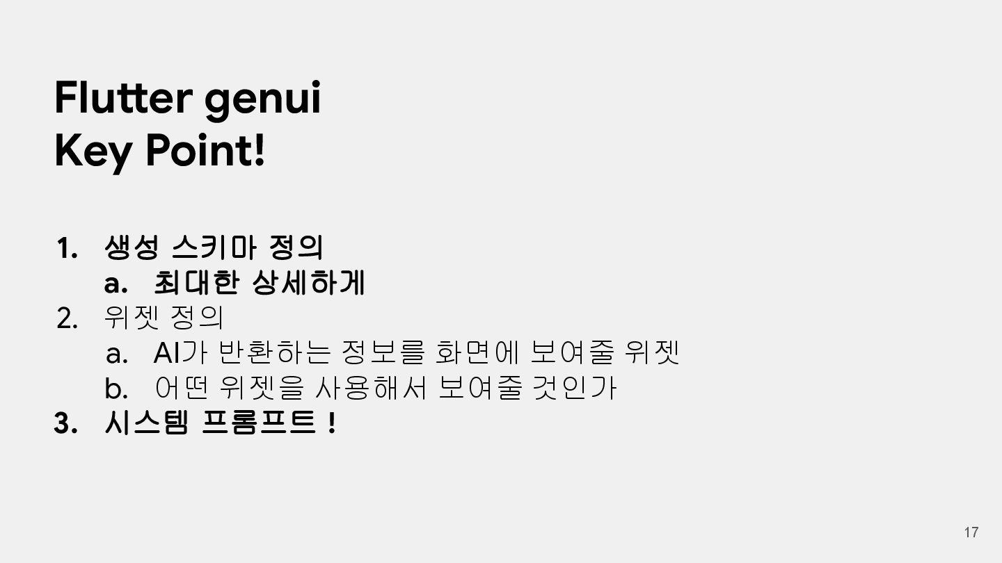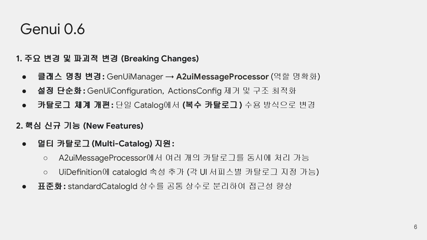 명칭 변경: GenUiManager → A2uiMessageProcessor (역할 명확화) • 설정 단순화: GenUiConfiguration, ActionsConfig 제거 및 구조 최적화 • 카탈로그 체계 개편: 단일 Catalog에서 (복수 카탈로그 ) 수용 방식으로 변경 2. 핵심 신규 기능 (New Features) • 멀티 카탈로그 (Multi-Catalog) 지원: ◦ A2uiMessageProcessor에서 여러 개의 카탈로그를 동시에 처리 가능 ◦ UiDefinition에 catalogId 속성 추가 (각 UI 서피스별 카탈로그 지정 가능) • 표준화: standardCatalogId 상수를 공통 상수로 분리하여 접근성 향상 Genui 0.6 6