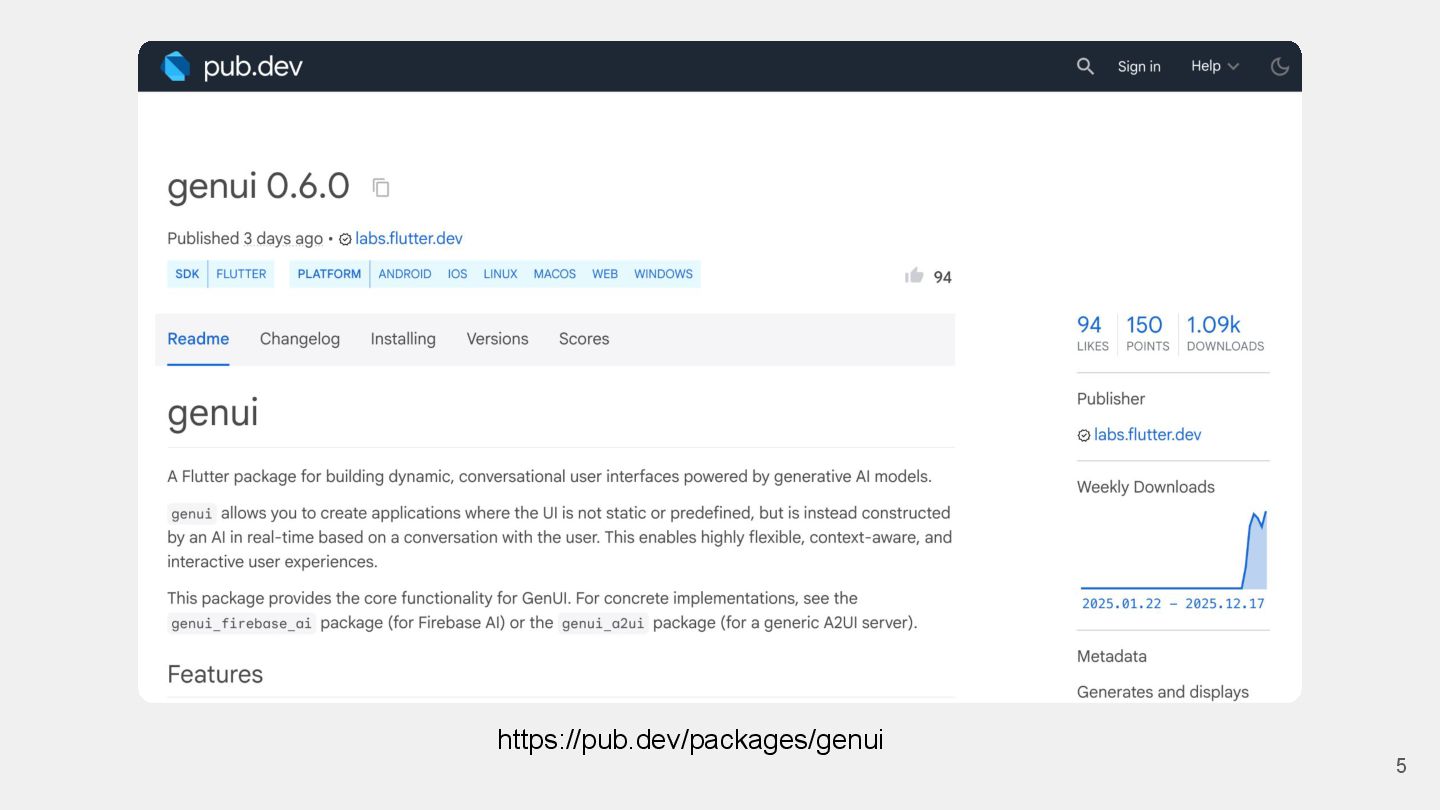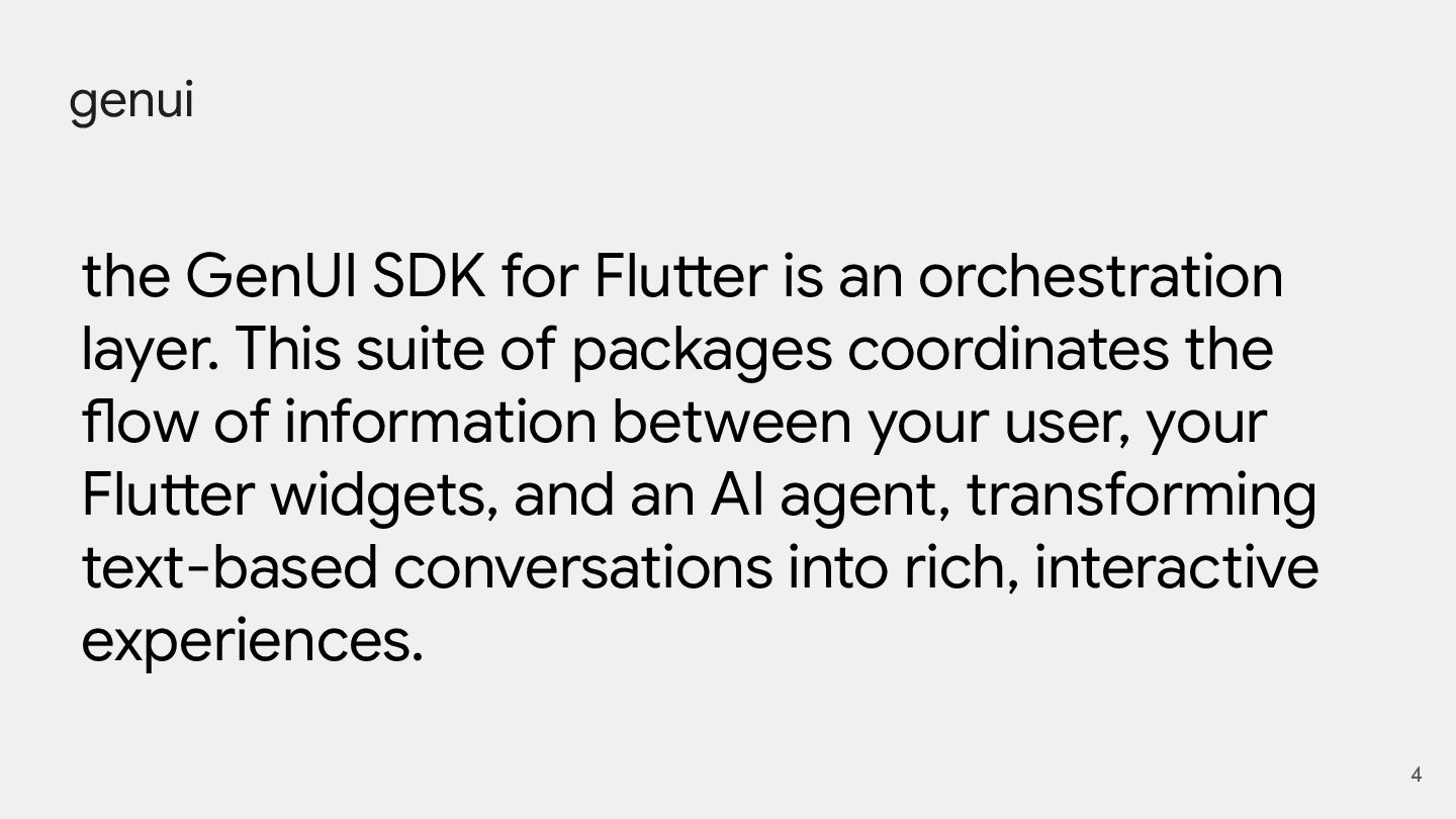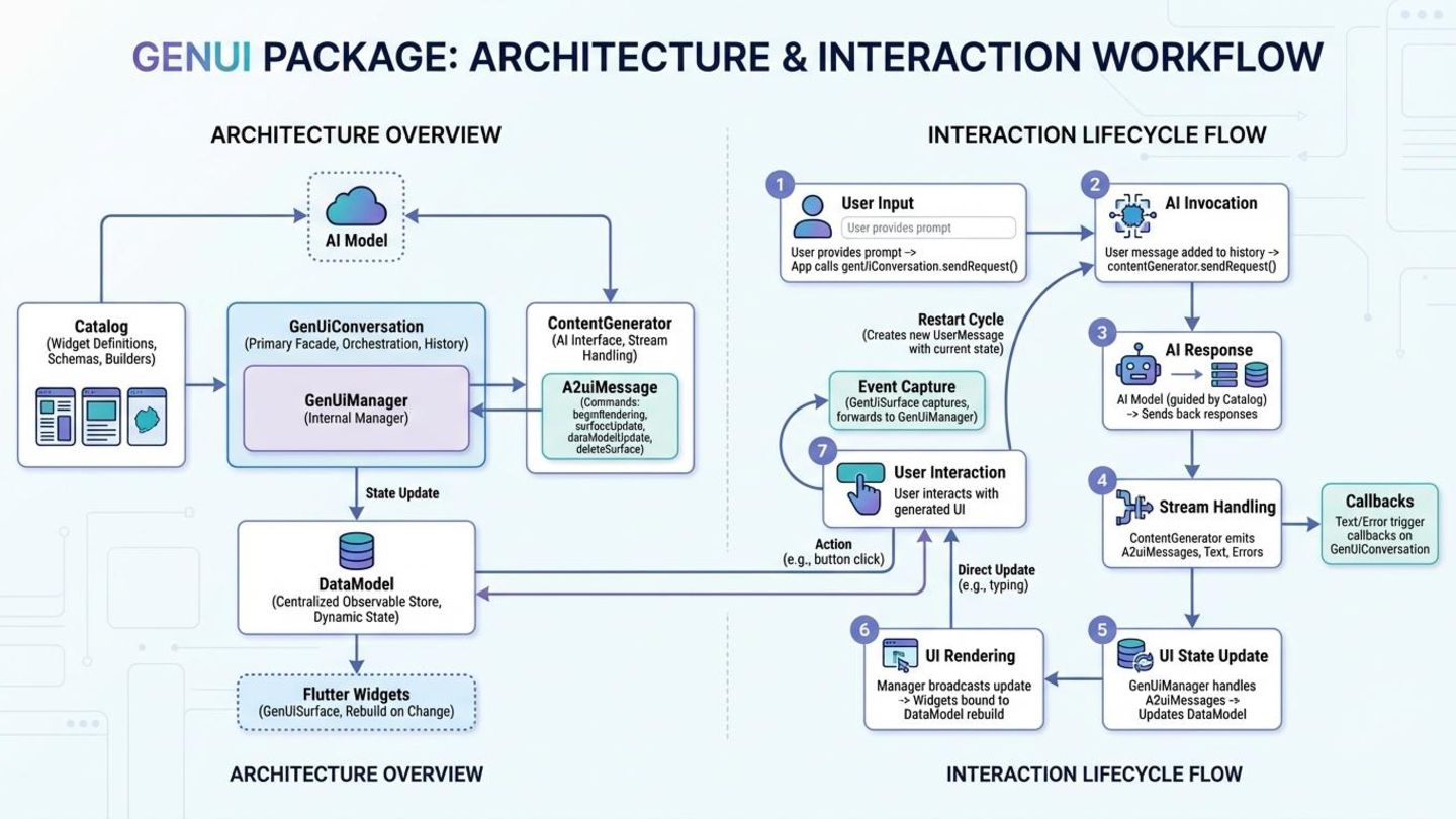 This suite of packages coordinates the flow of information between your user, your Flutter widgets, and an AI agent, transforming text-based conversations into rich, interactive experiences. 4
