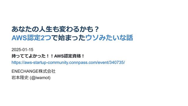 あなたの人生も変わるかも? AWS認定2つで始まったウソみたいな話 2025-01-15 持っててよかった!!AWS認定資格! https://aws-startup-community.connpass.com/event/340735/ ENECHANGE株式会社 岩本隆史 (@iwamot)