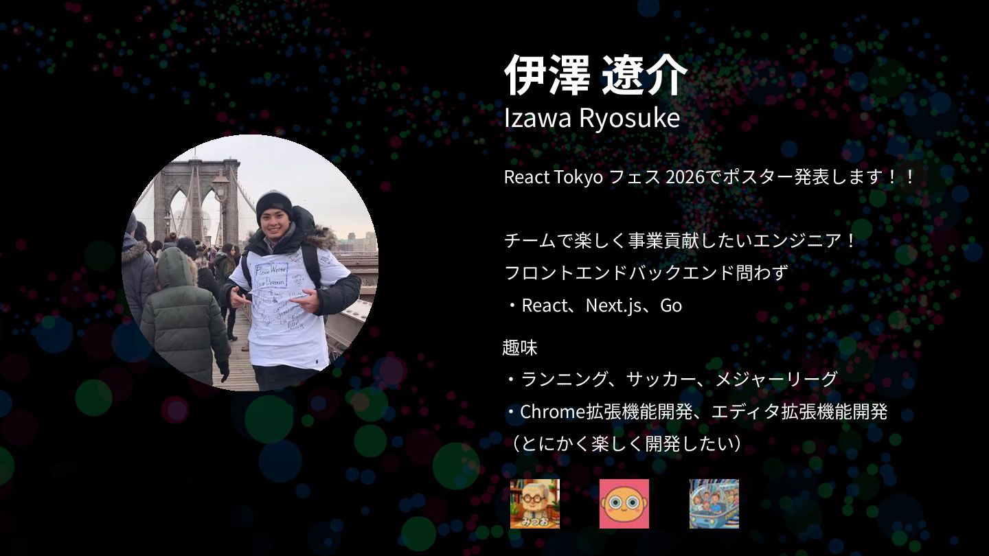 React Tokyo フェス 2026でポスター発表します!! チームで楽しく事業貢献したいエンジニア! フロントエンドバックエンド問わず ‧React、Next.js、Go 伊澤 遼介 Izawa