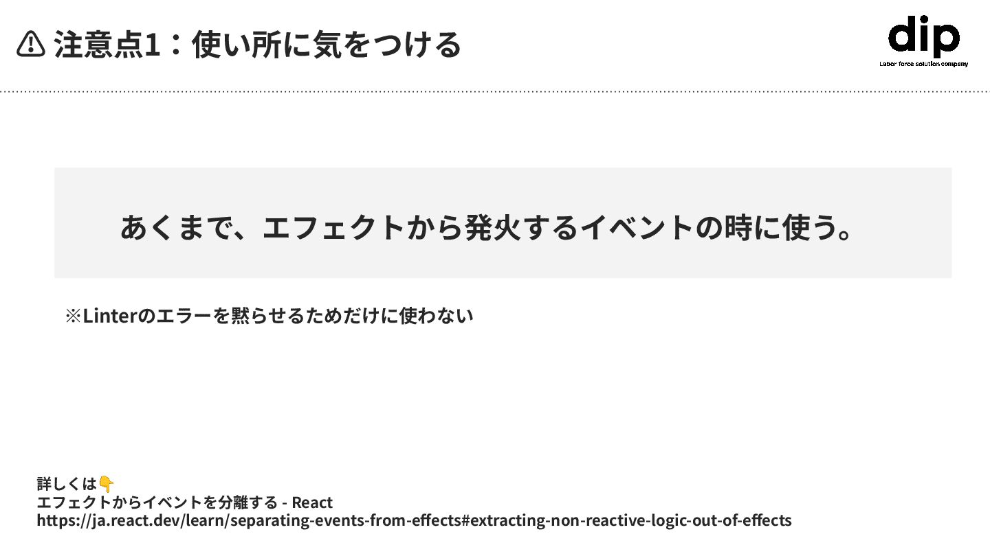 c あくまで、エフェクトから発⽕するイベントの時に使う。 ⚠ 注意点1:使い所に気をつける 詳しくは👇 エフェクトからイベントを分離する - React https://ja.react.dev/learn/separating-events-from-effects#extracting-non-reactive-logic-out-of-effects ※Linterのエラーを黙らせるためだけに使わない