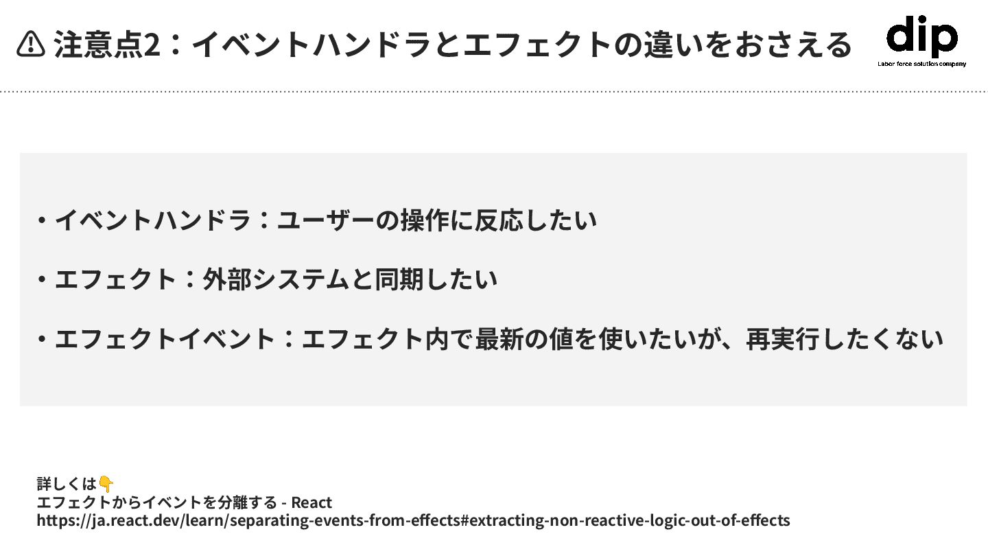 ⚠ 注意点2:イベントハンドラとエフェクトの違いをおさえる 詳しくは👇 エフェクトからイベントを分離する - React https://ja.react.dev/learn/separating-events-from-effects#extracting-non-reactive-logic-out-of-effects ‧イベントハンドラ:ユーザーの操作に反応したい ‧エフェクト:外部システムと同期したい ‧エフェクトイベント:エフェクト内で最新の値を使いたいが、再実⾏したくない