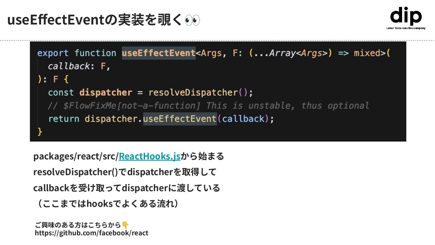useEffectEventの実装を覗く👀 packages/react/src/ReactHooks.jsから始まる resolveDispatcher()でdispatcherを取得して callbackを受け取ってdispatcherに渡している (ここまではhooksでよくある流れ) ご興味のある⽅はこちらから👇 https://github.com/facebook/react