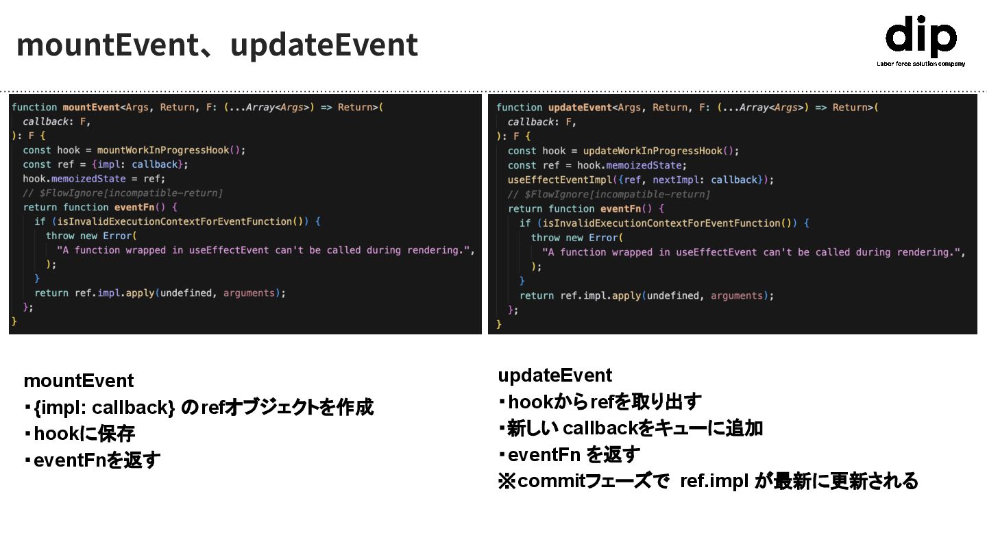 updateEvent ・hookからrefを取り出す ・新しい callbackをキューに追加 ・eventFn を返す ※commitフェーズで ref.impl が最新に更新される mountEvent