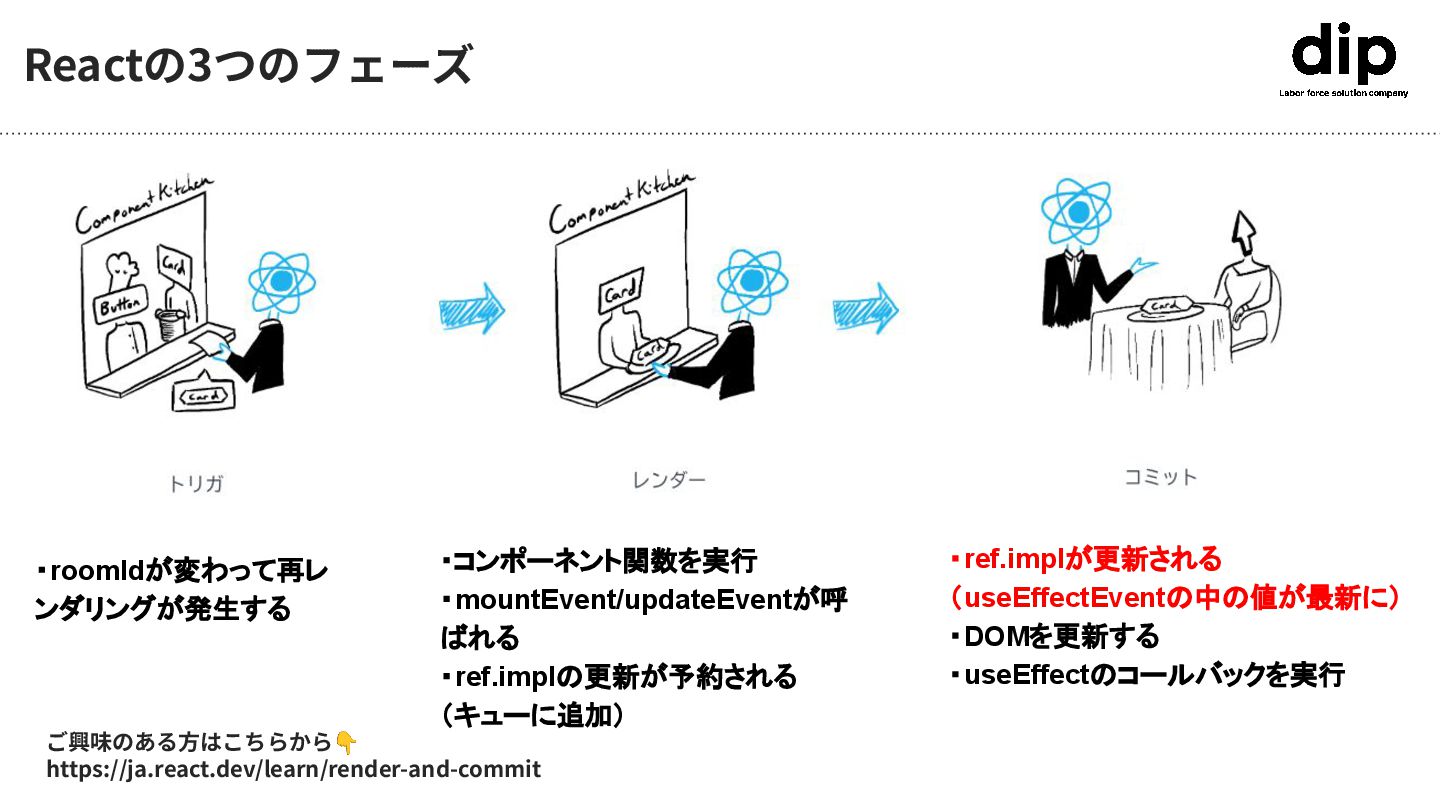 ・roomIdが変わって再レ ンダリングが発生する Reactの3つのフェーズ ・コンポーネント関数を実行 ・mountEvent/updateEventが呼 ばれる ・ref.implの更新が予約される (キューに追加) ・ref.implが更新される (useEffectEventの中の値が最新に)