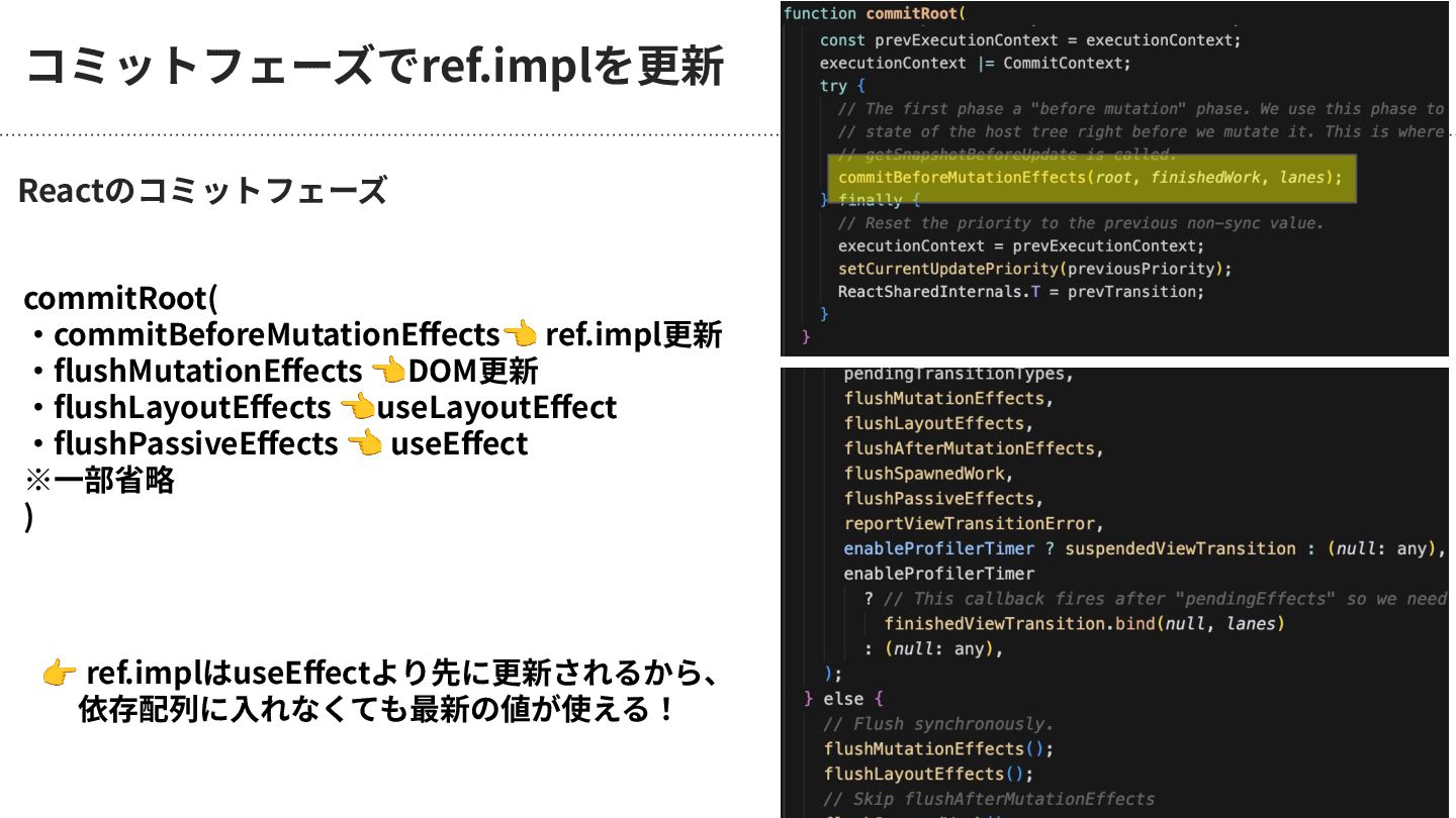 ※⼀部省略 ) コミットフェーズでref.implを更新 Reactのコミットフェーズ 👉 ref.implはuseEffectより先に更新されるから、 依存配列に⼊れなくても最新の値が使える!