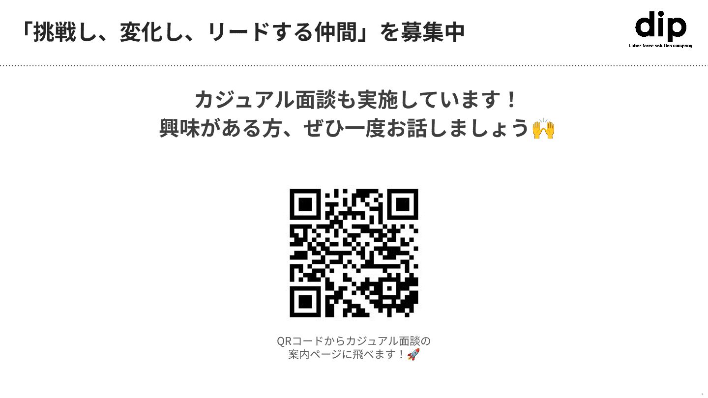 QRコードからカジュアル⾯談の 案内ページに⾶べます!🚀 「挑戦し、変化し、リードする仲間」を募集中 カジュアル⾯談も実施しています! 興味がある⽅、ぜひ⼀度お話しましょう🙌 3