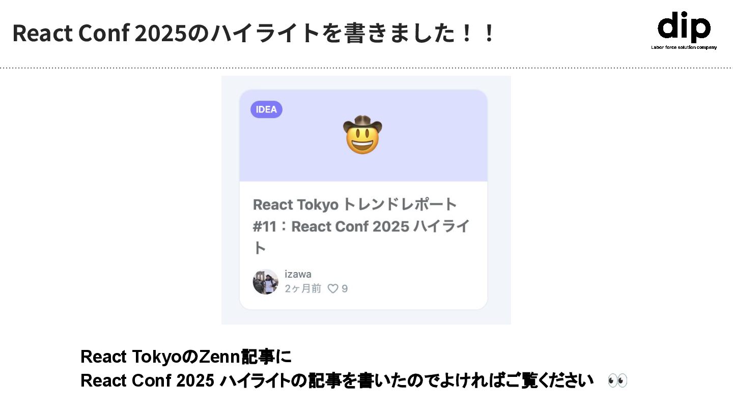 React Conf 2025のハイライトを書きました!! React TokyoのZenn記事に React Conf 2025 ハイライトの記事を書いたのでよければご覧ください 👀