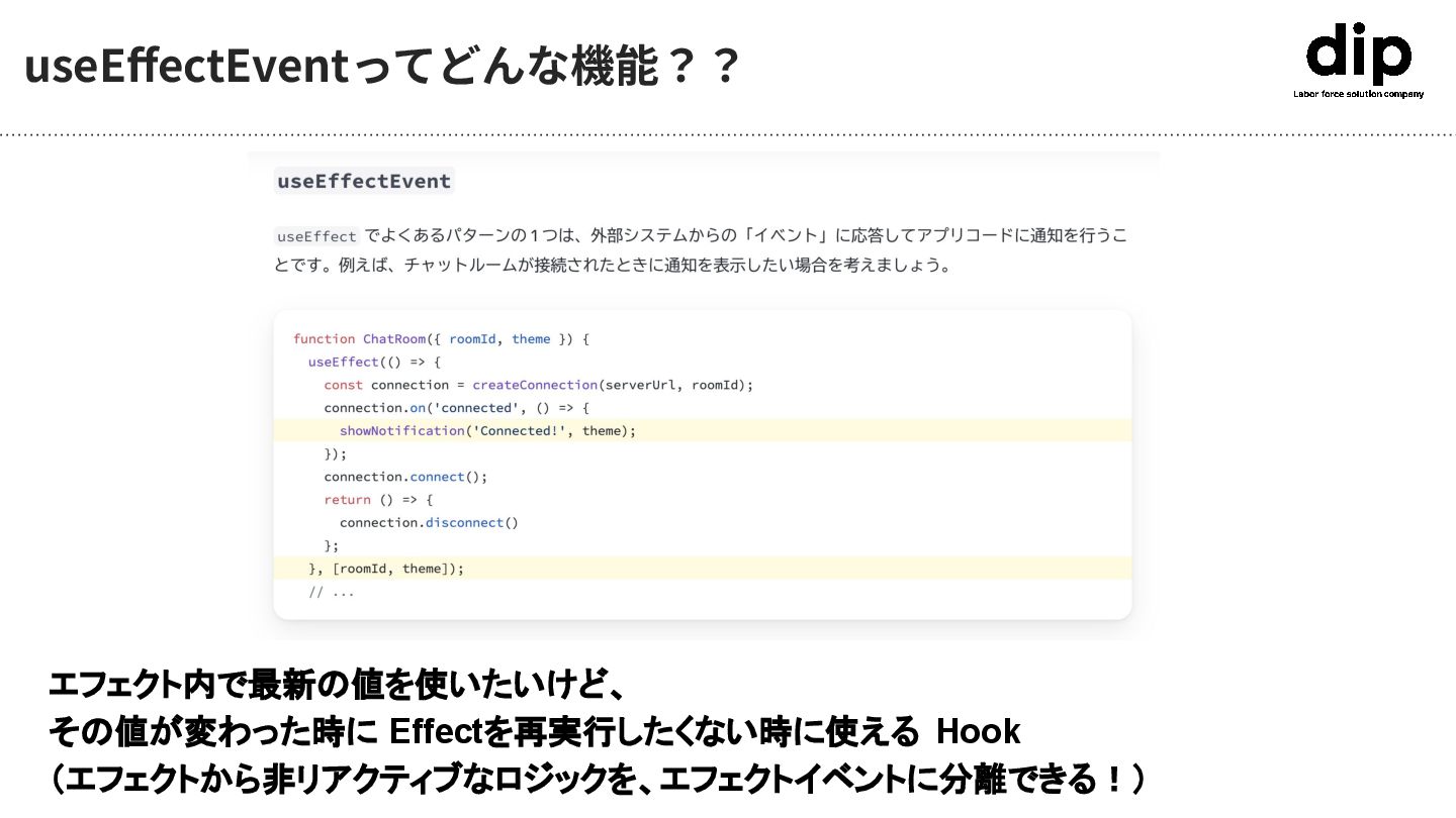 useEffectEventってどんな機能?? エフェクト内で最新の値を使いたいけど、 その値が変わった時に Effectを再実行したくない時に使える Hook (エフェクトから非リアクティブなロジックを、エフェクトイベントに分離できる!)