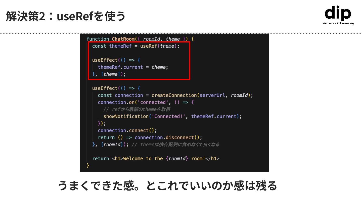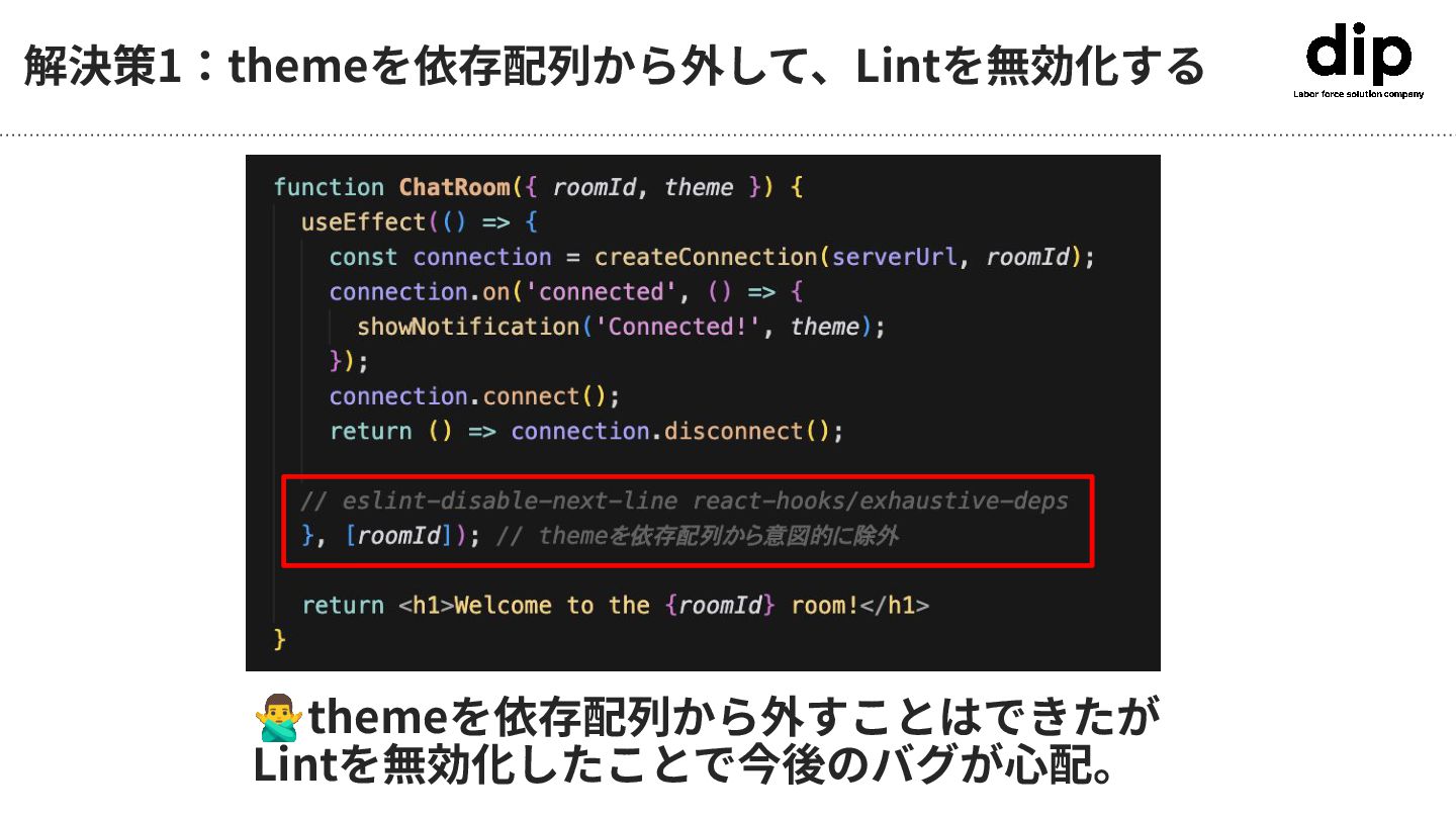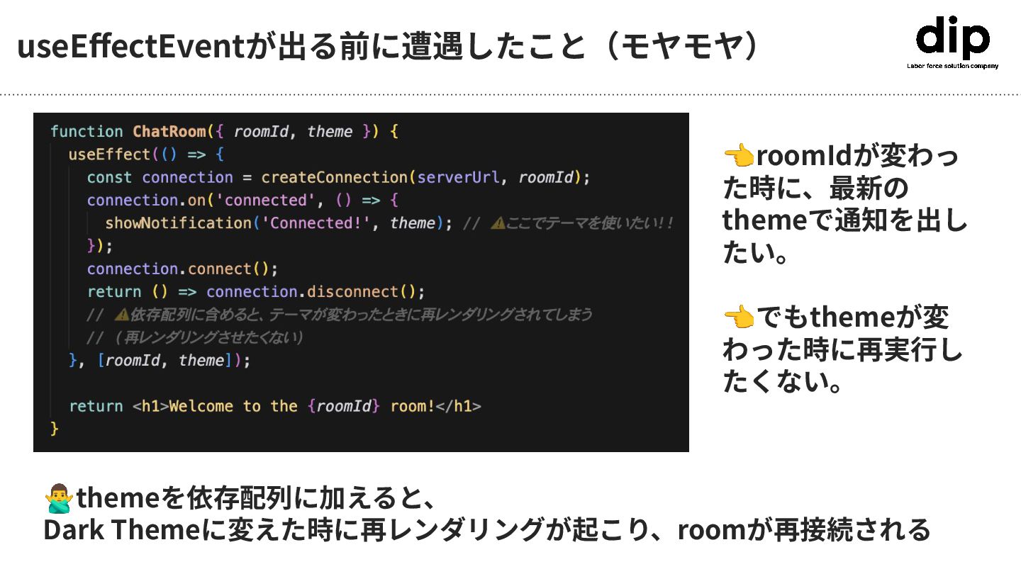 useEffectEventが出る前に遭遇したこと(モヤモヤ) themeを依存配列に加えると、 Dark Themeに変えた時に再レンダリングが起こり、roomが再接続される 👈roomIdが変わっ た時に、最新の themeで通知を出し たい。 👈でもthemeが変 わった時に再実⾏し