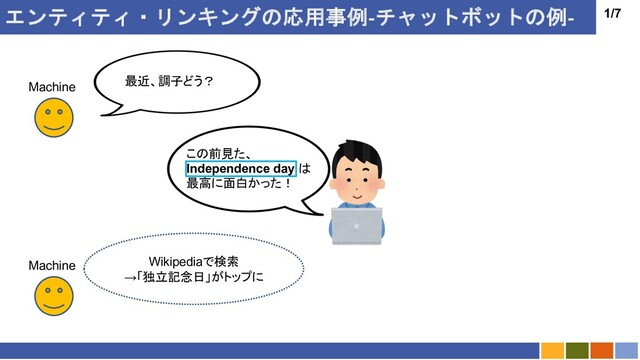 1/7 エンティティ・リンキングの応用事例-チャットボットの例- 1 Machine 最近、調子どう? この前見た、 Independence day は 最高に面白かった!