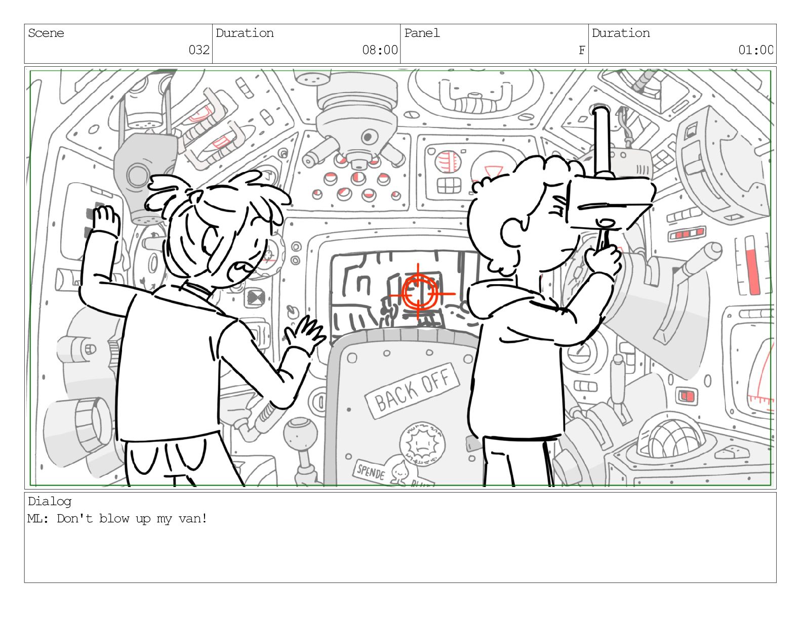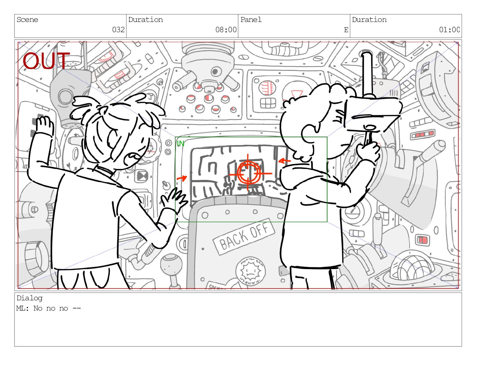 Scene 032 Duration 08:00 Panel F Duration 01:00 Dialog ML: