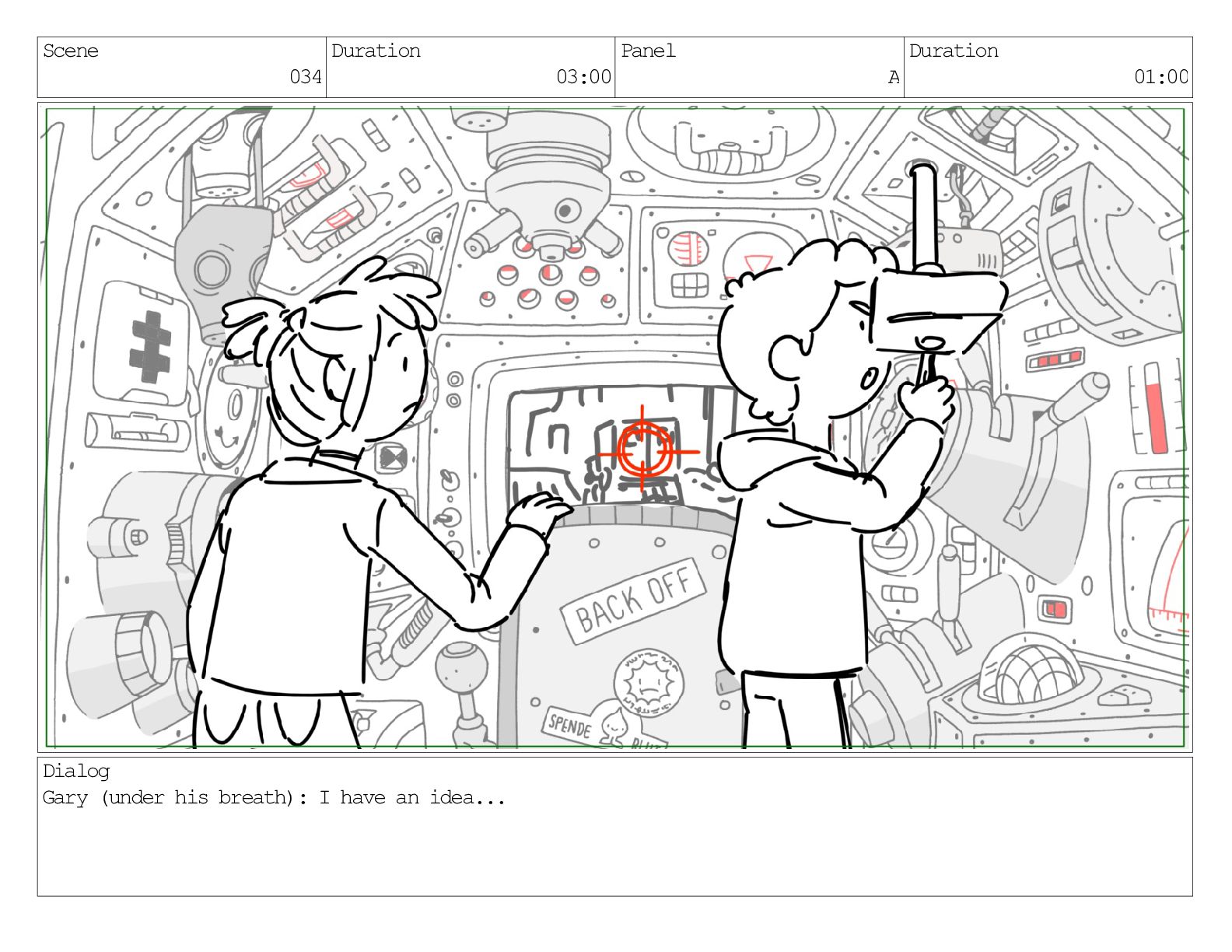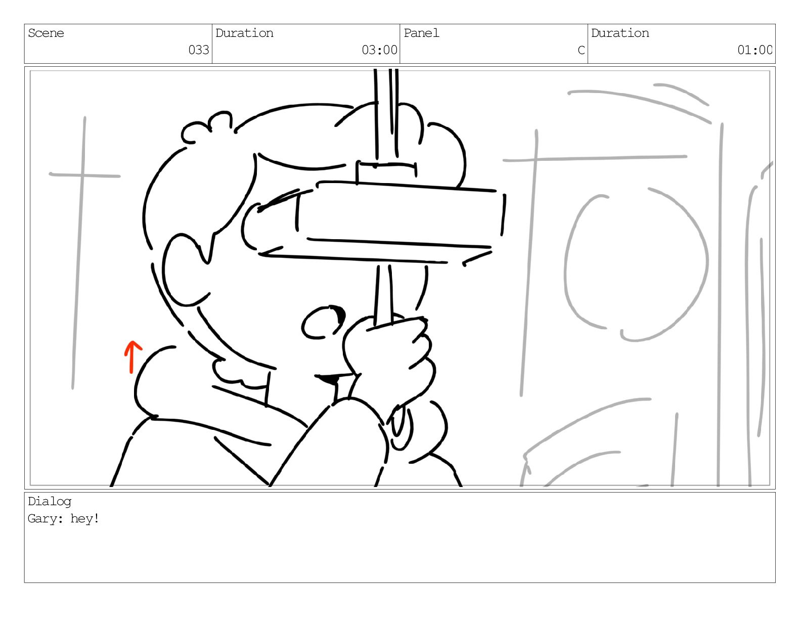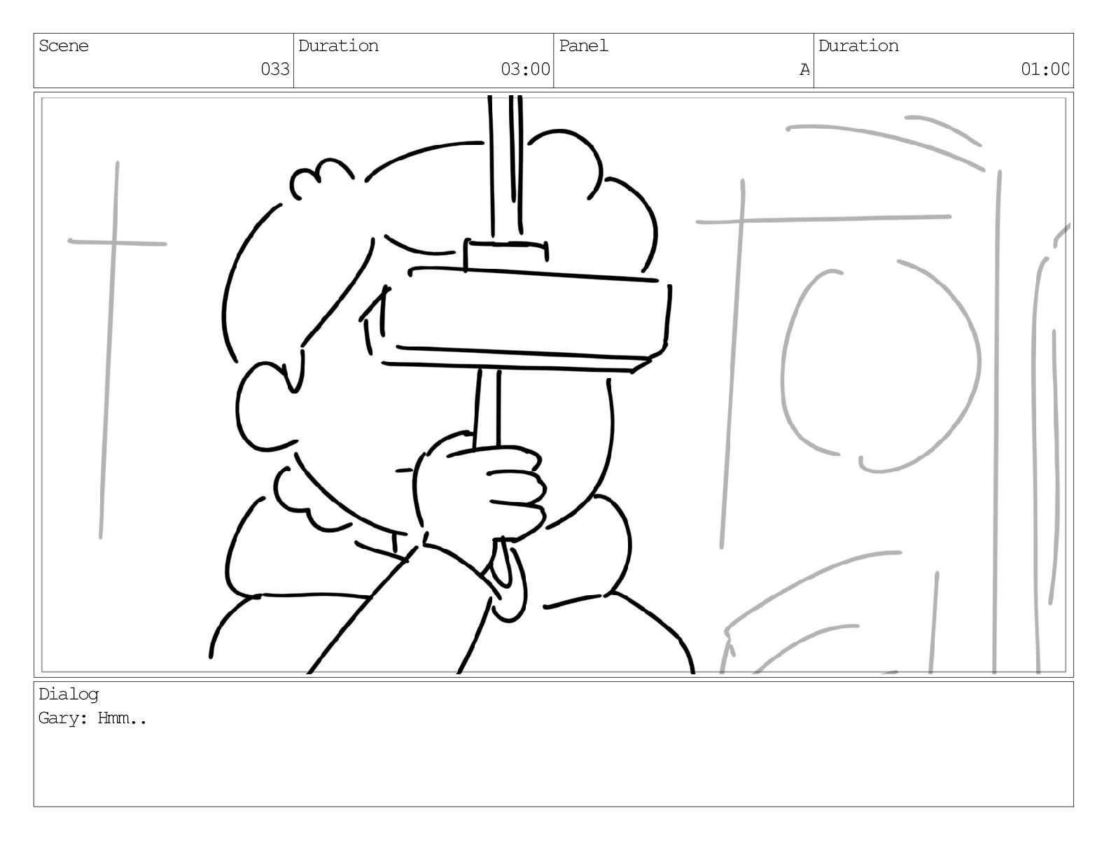 Scene 033 Duration 03:00 Panel A Duration 01:00 Dialog Gary: