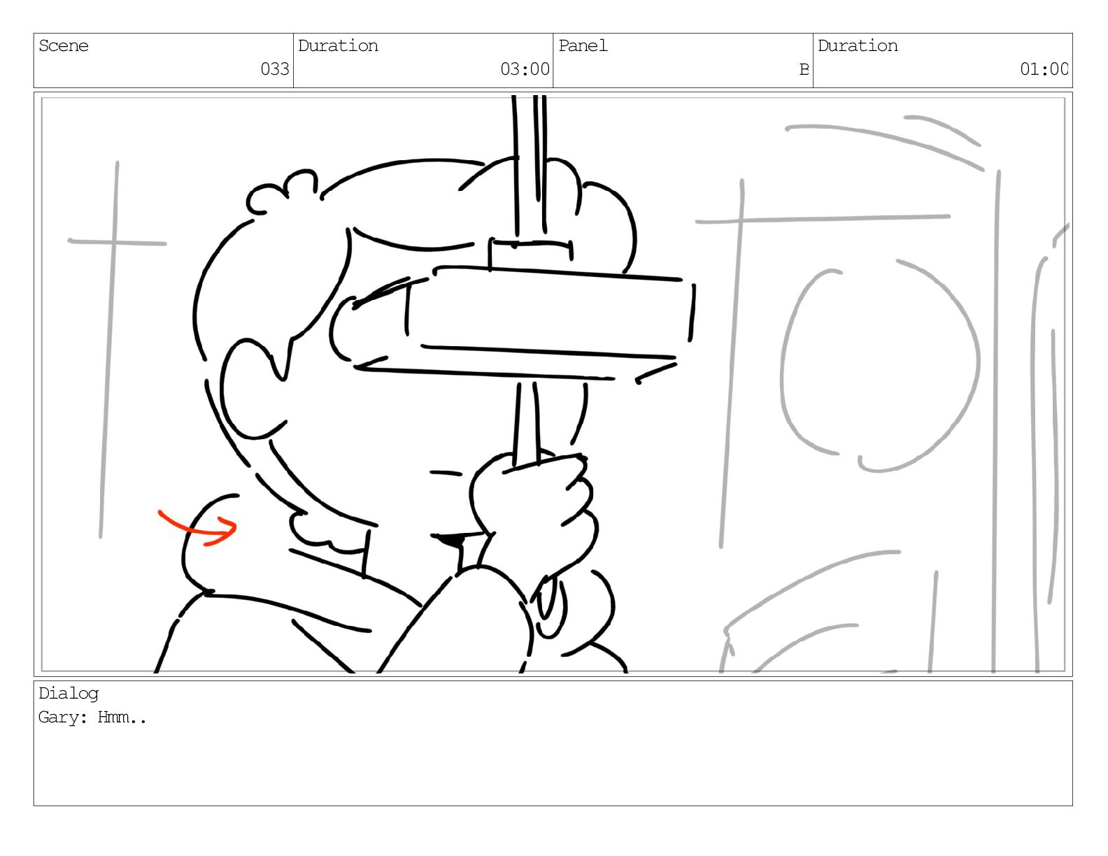 Scene 033 Duration 03:00 Panel B Duration 01:00 Dialog Gary: