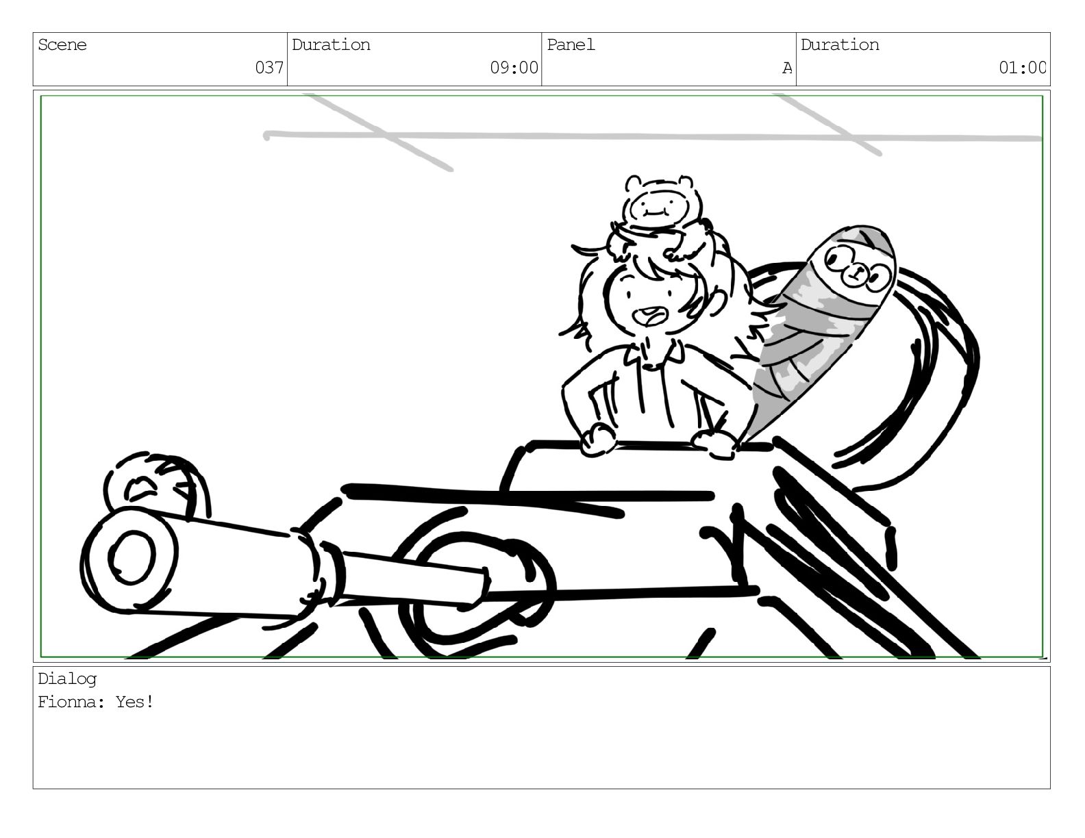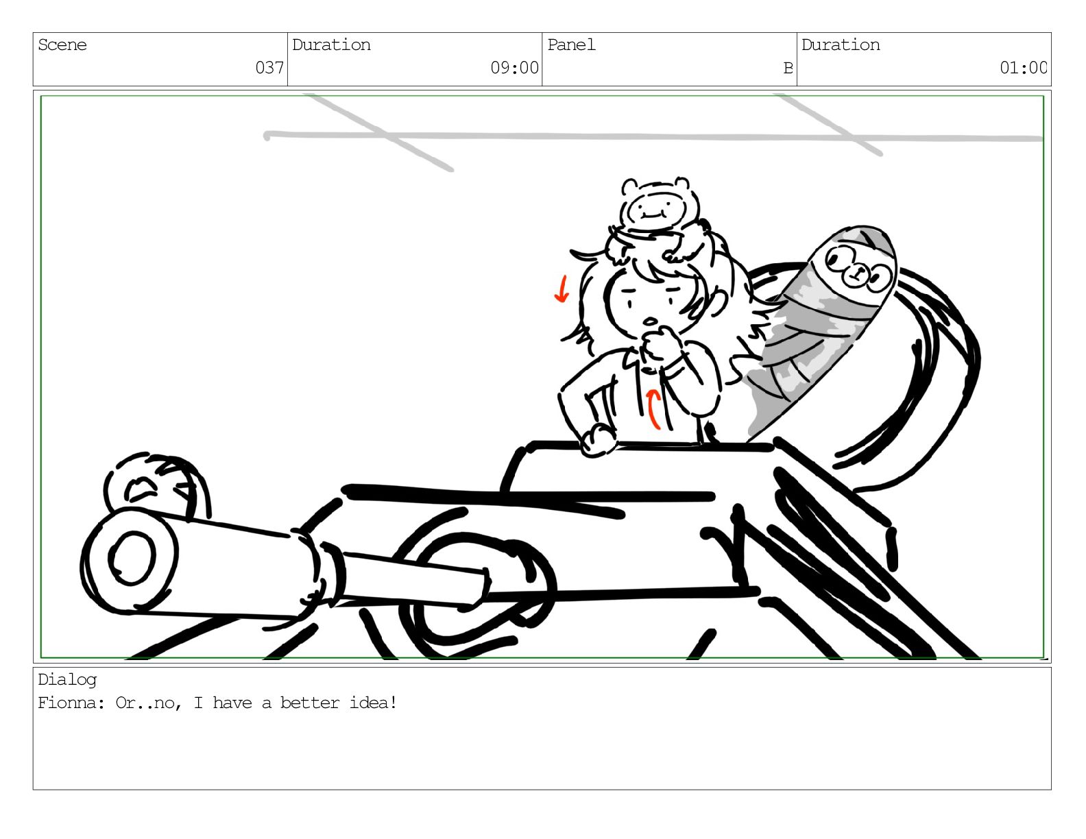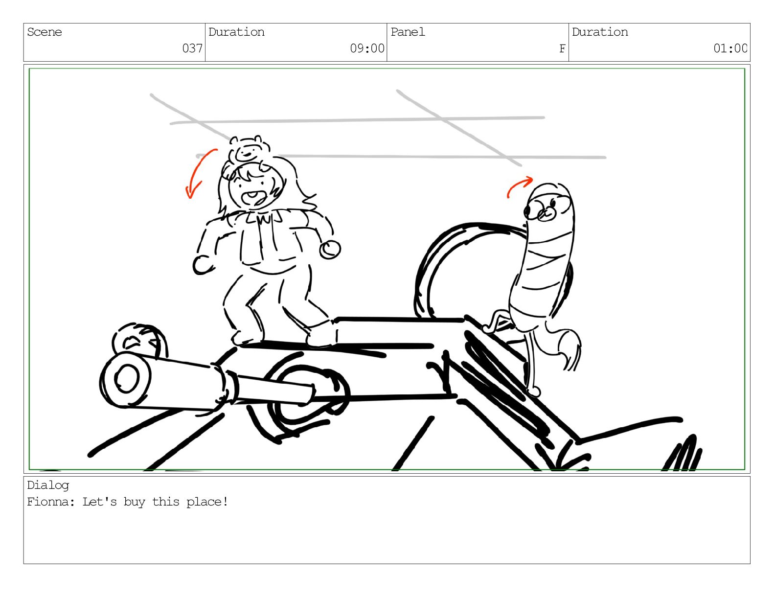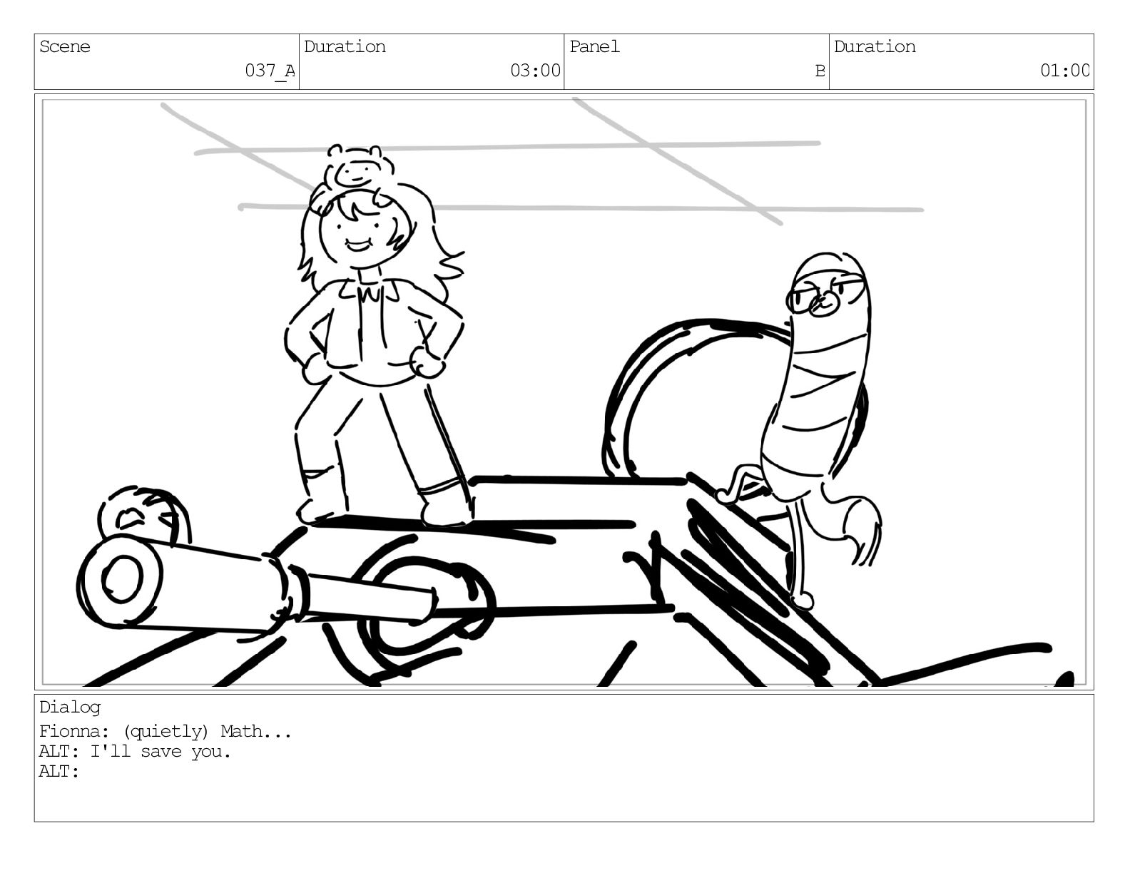 Scene 037 Duration 09:00 Panel A Duration 01:00 Dialog Fionna: