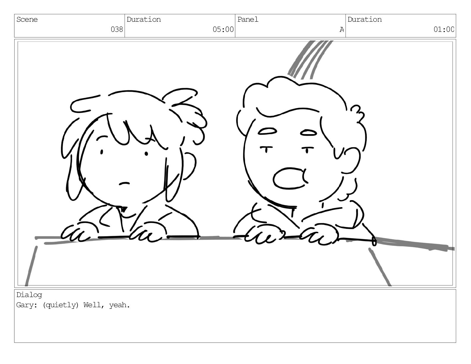 Scene 038 Duration 05:00 Panel A Duration 01:00 Dialog Gary: