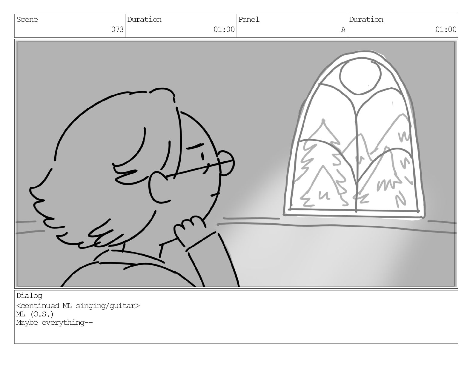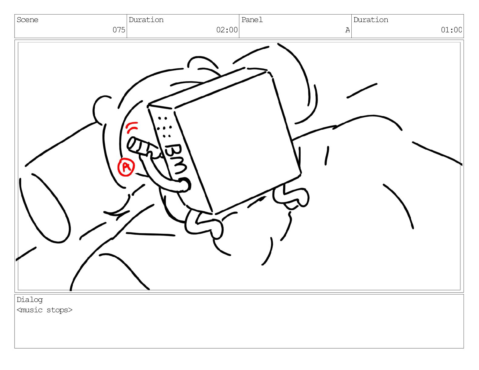 Scene 075 Duration 02:00 Panel A Duration 01:00 Dialog <music