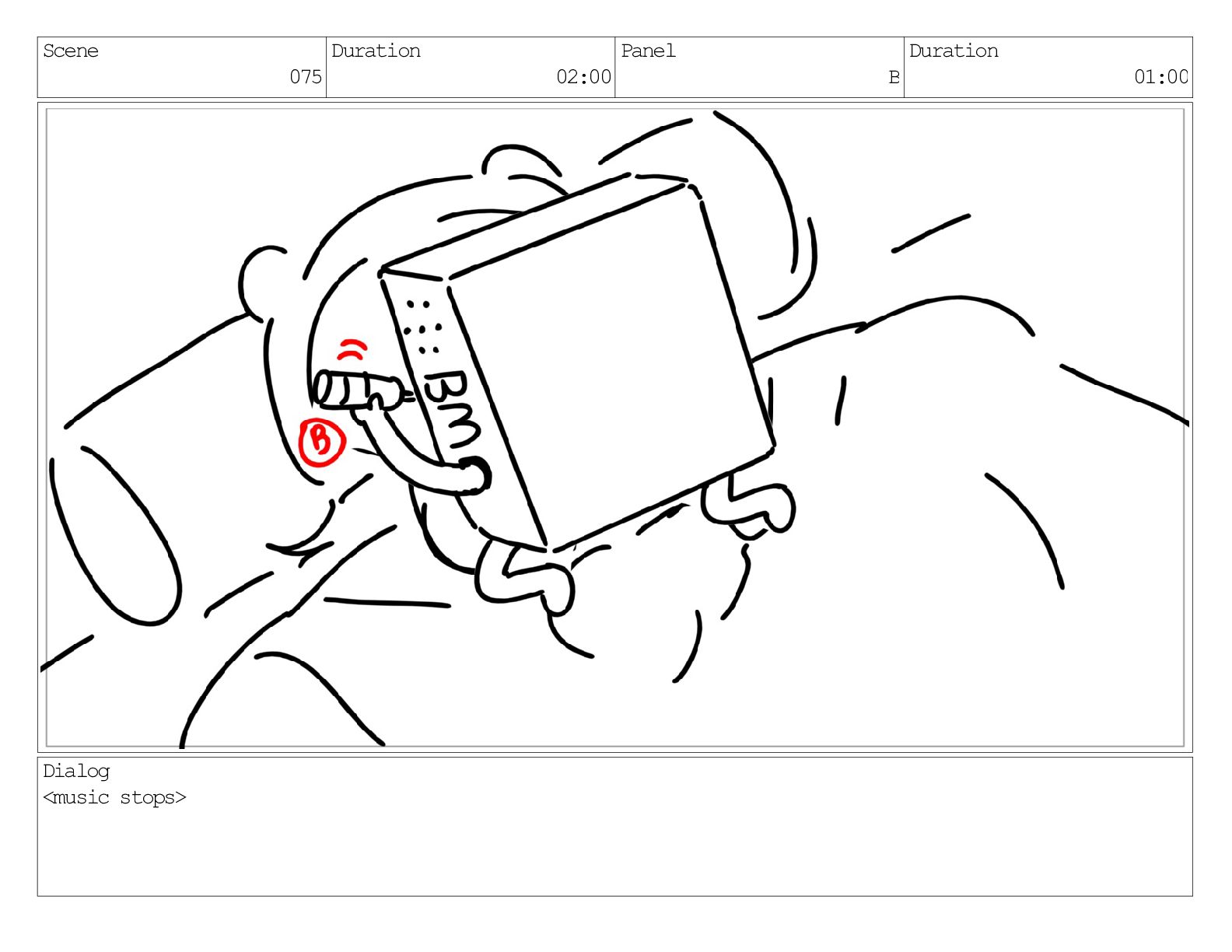 Scene 075 Duration 02:00 Panel B Duration 01:00 Dialog <music