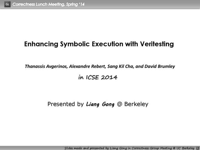 Liang Gong @ Berkeley Thanassis Avgerinos, Alexandre Rebert, Sang Kil Cha, and David Brumley Slides made and presented by Liang Gong in Correctness Group Meeting @ UC Berkeley