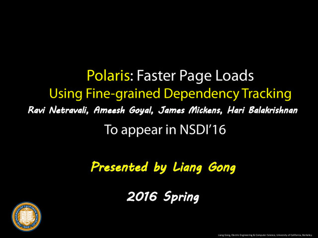 Using Fine-grained Dependency Tracking Liang Gong, Electric Engineering & Computer Science, University of California, Berkeley. Ravi Netravali, Ameesh Goyal, James Mickens, Hari Balakrishnan To appear in NSDI’16