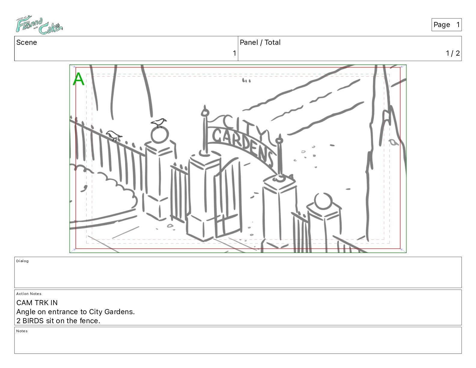 Notes CAM TRK IN Angle on entrance to City Gardens. 2 BIRDS sit on the fence. Notes Page 1