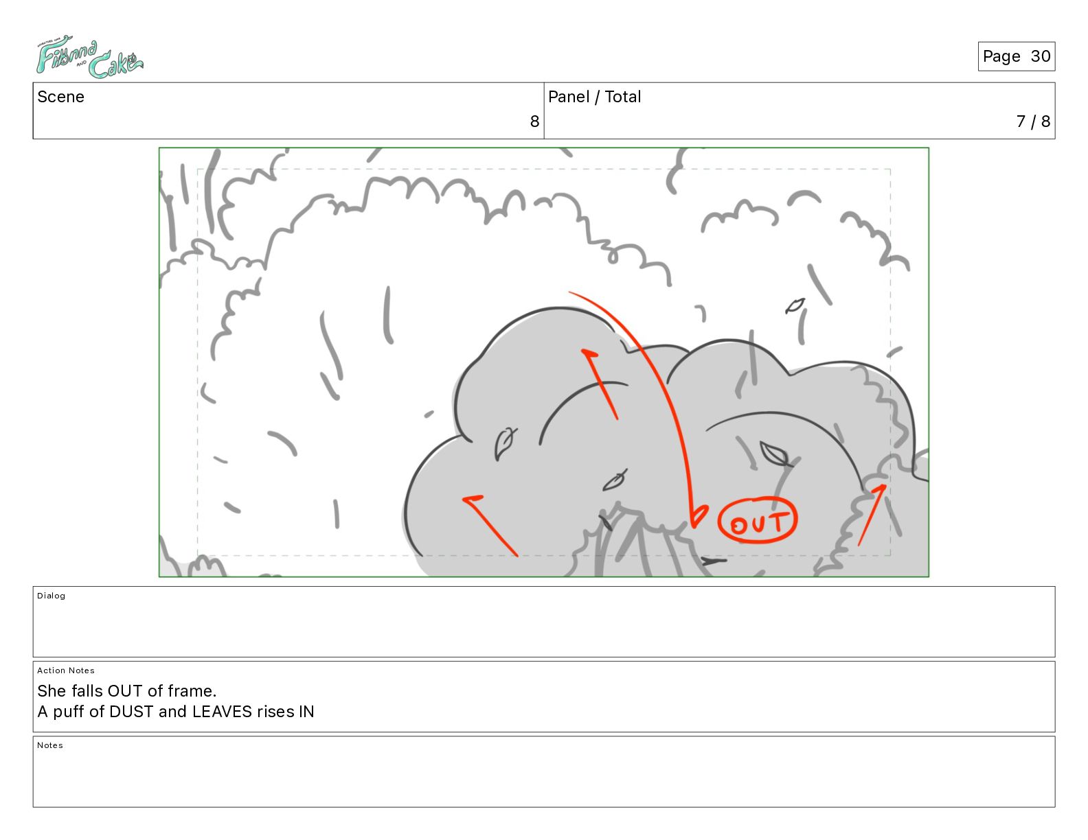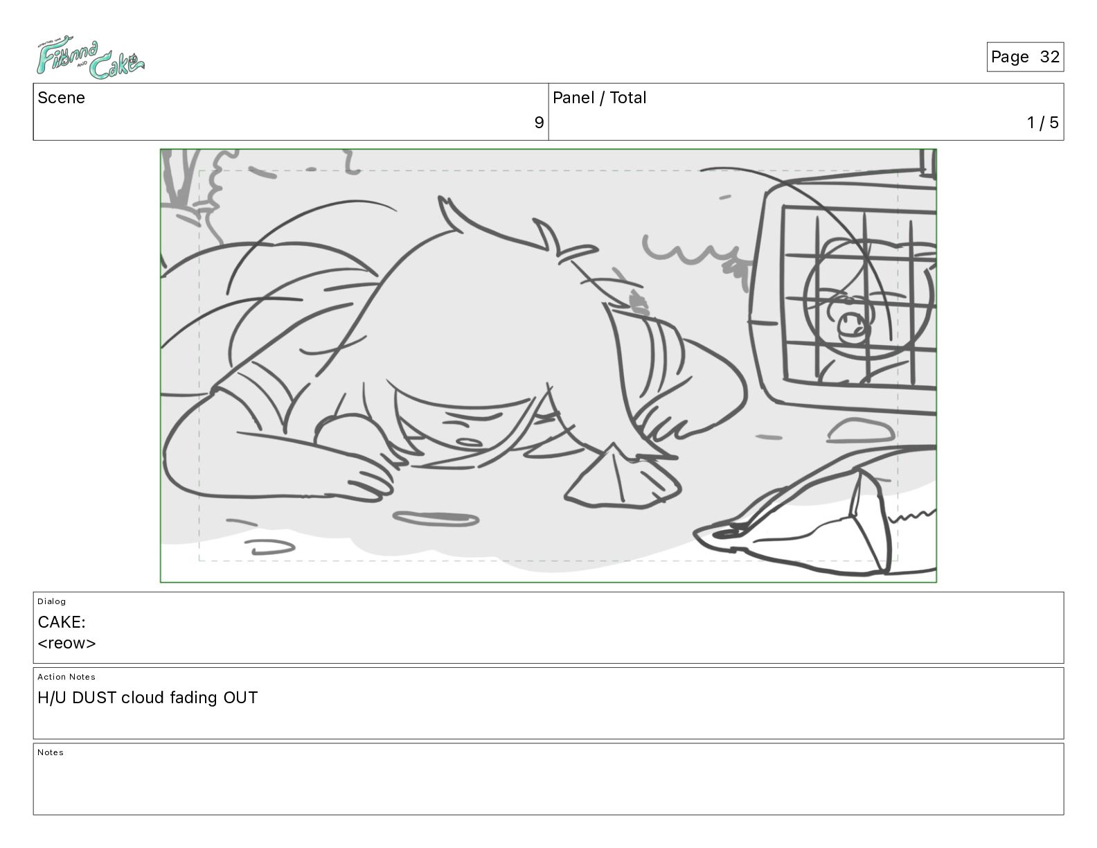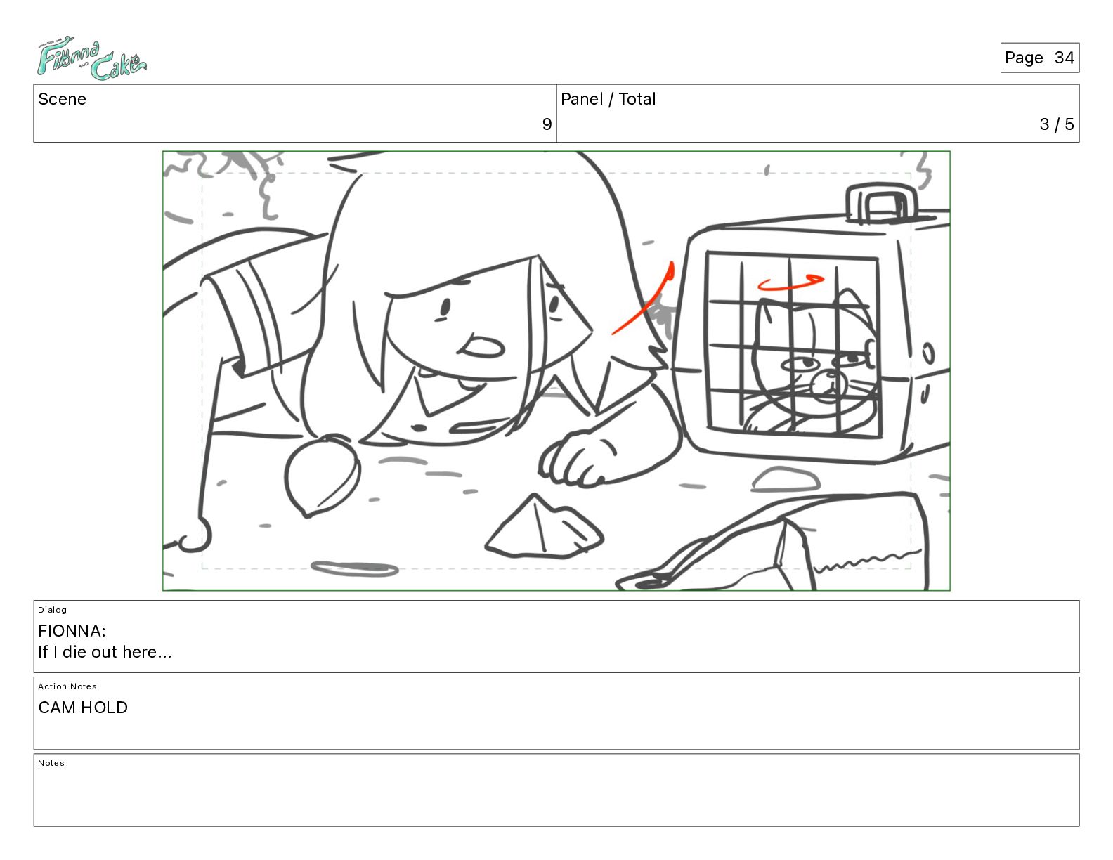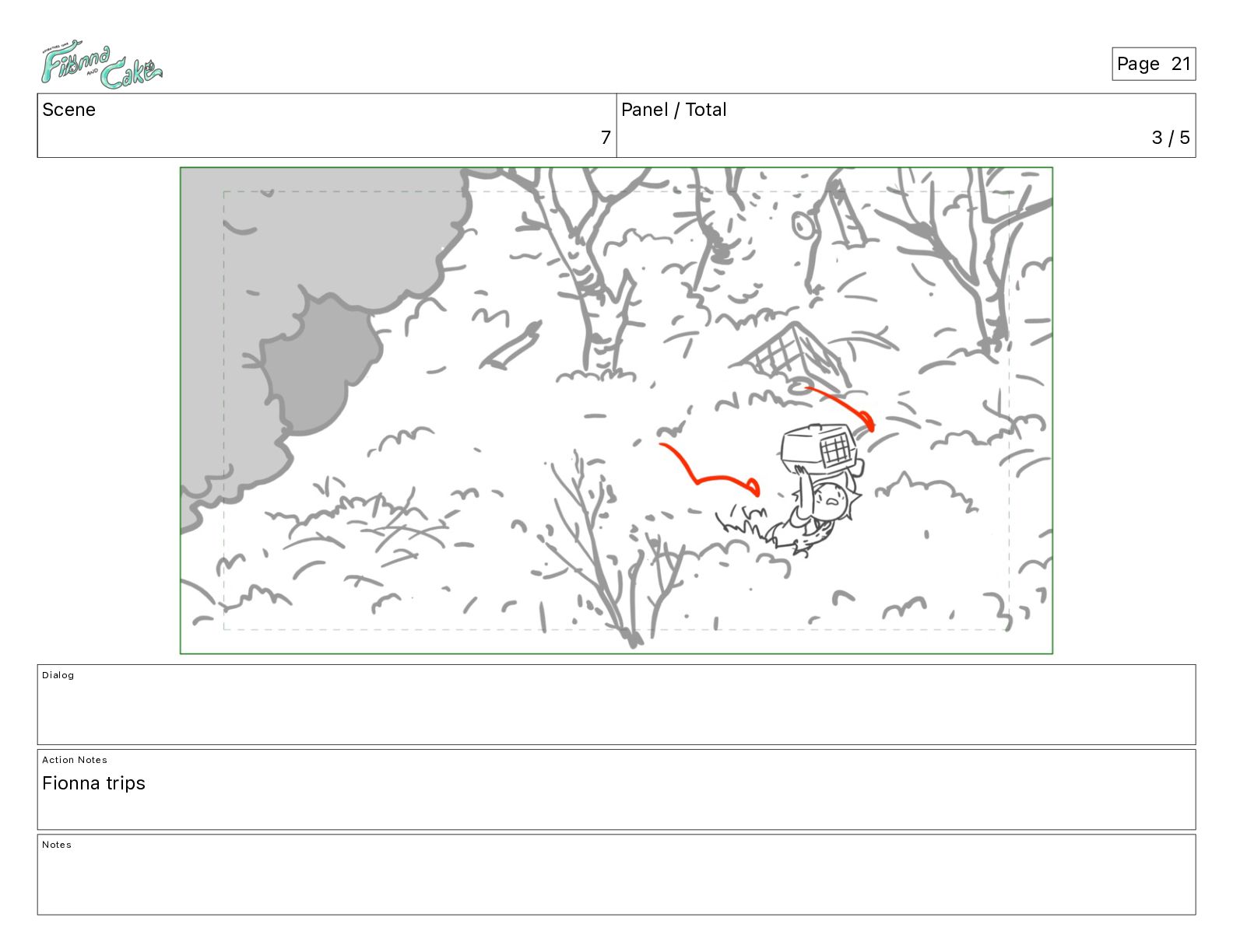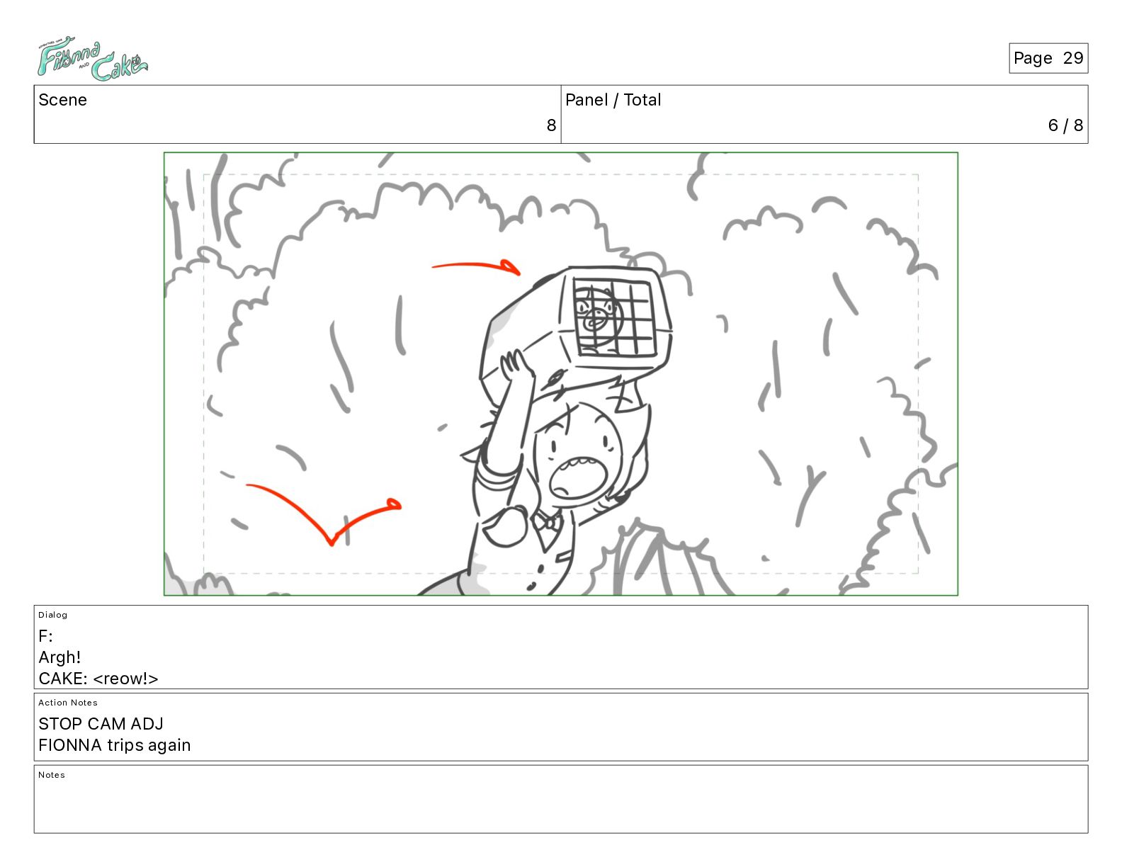 Argh! CAKE: <reow!> Action Notes STOP CAM ADJ FIONNA trips again Notes Page 29