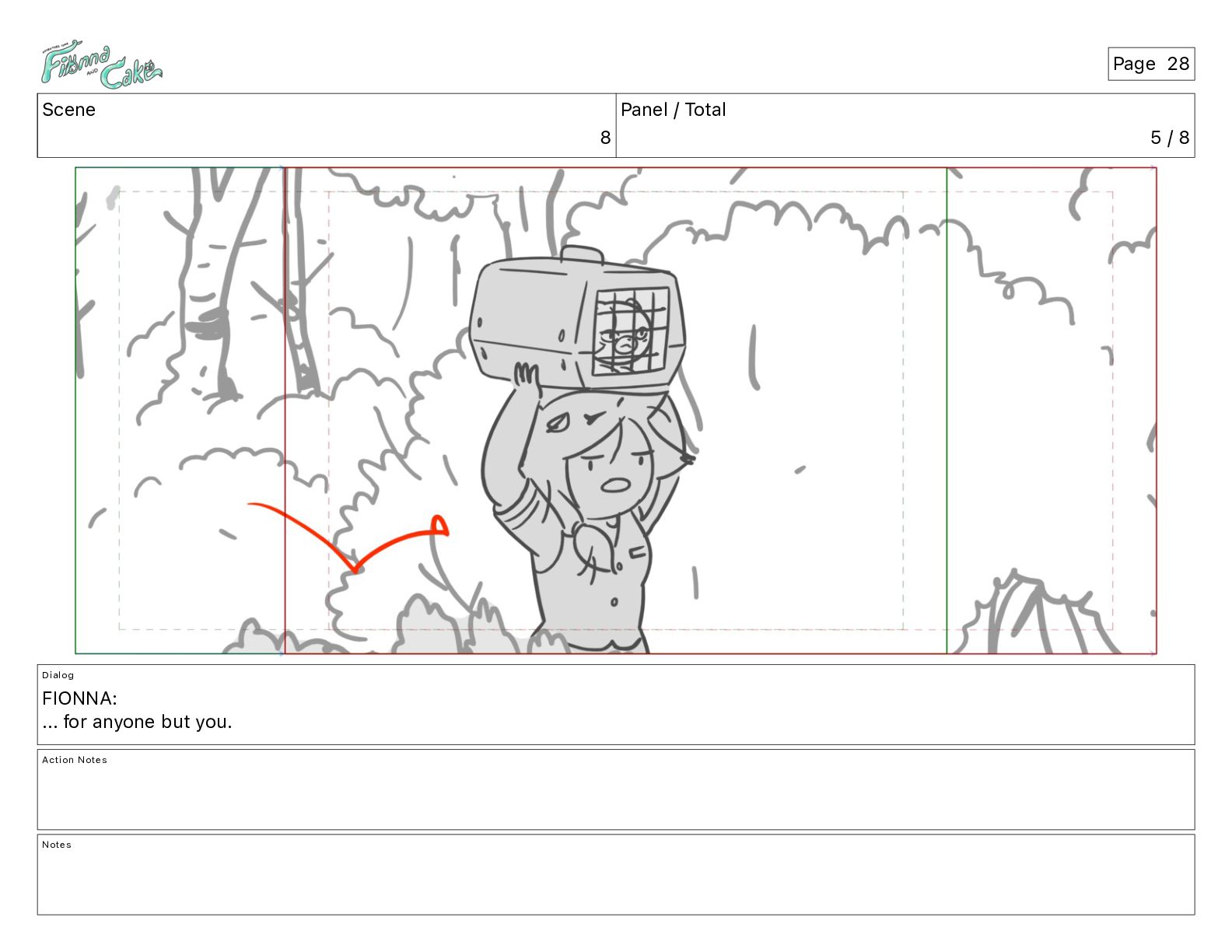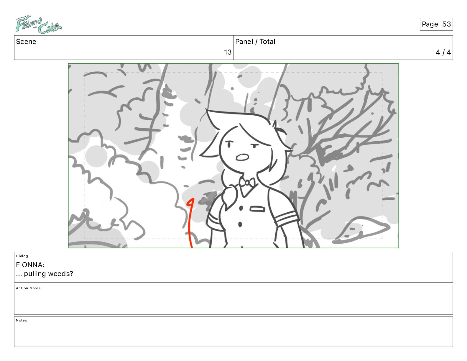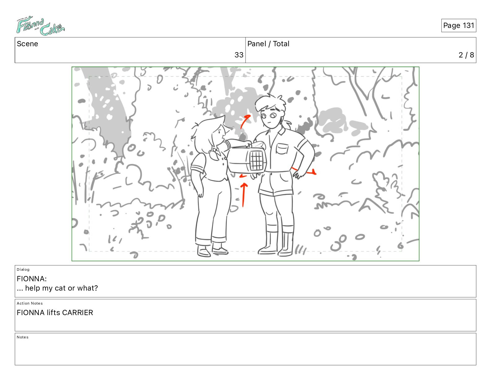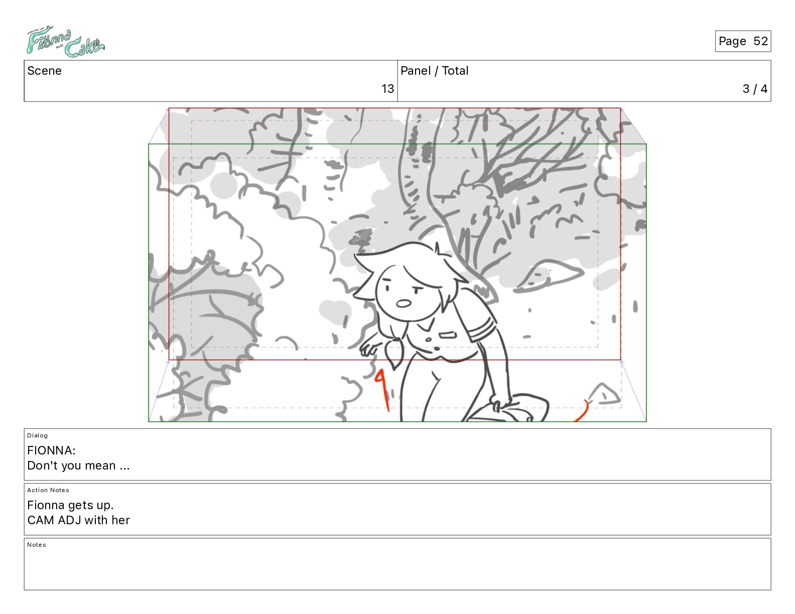 Argh! CAKE: <reow!> Action Notes STOP CAM ADJ FIONNA trips again Notes Page 29