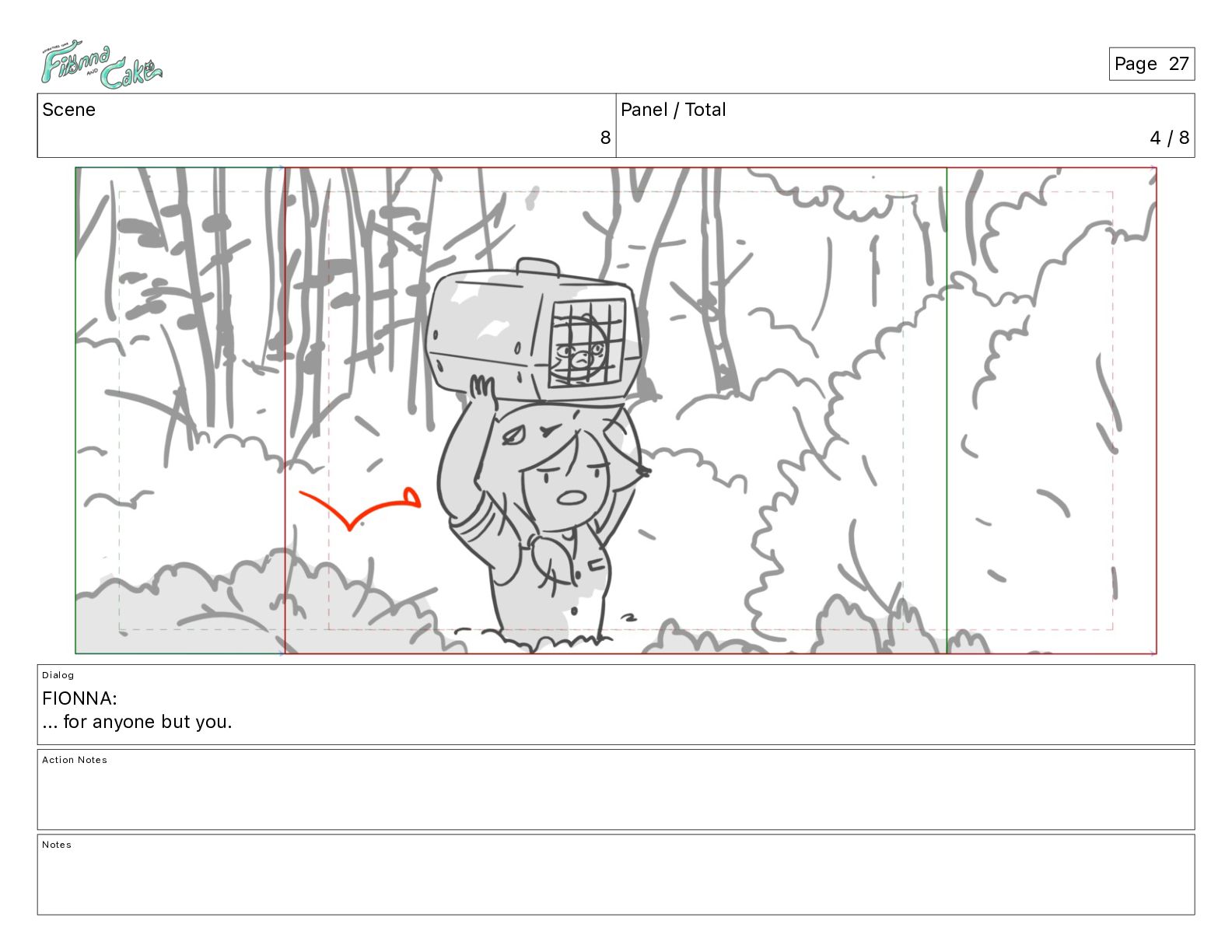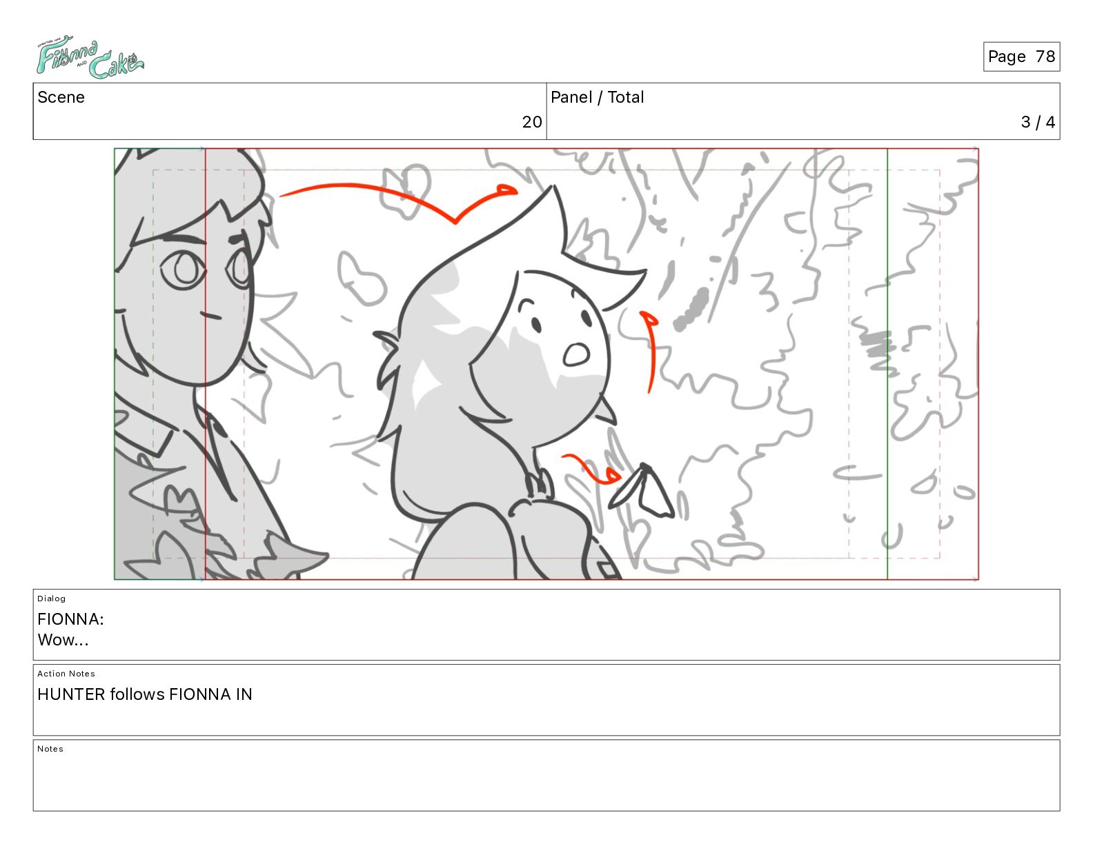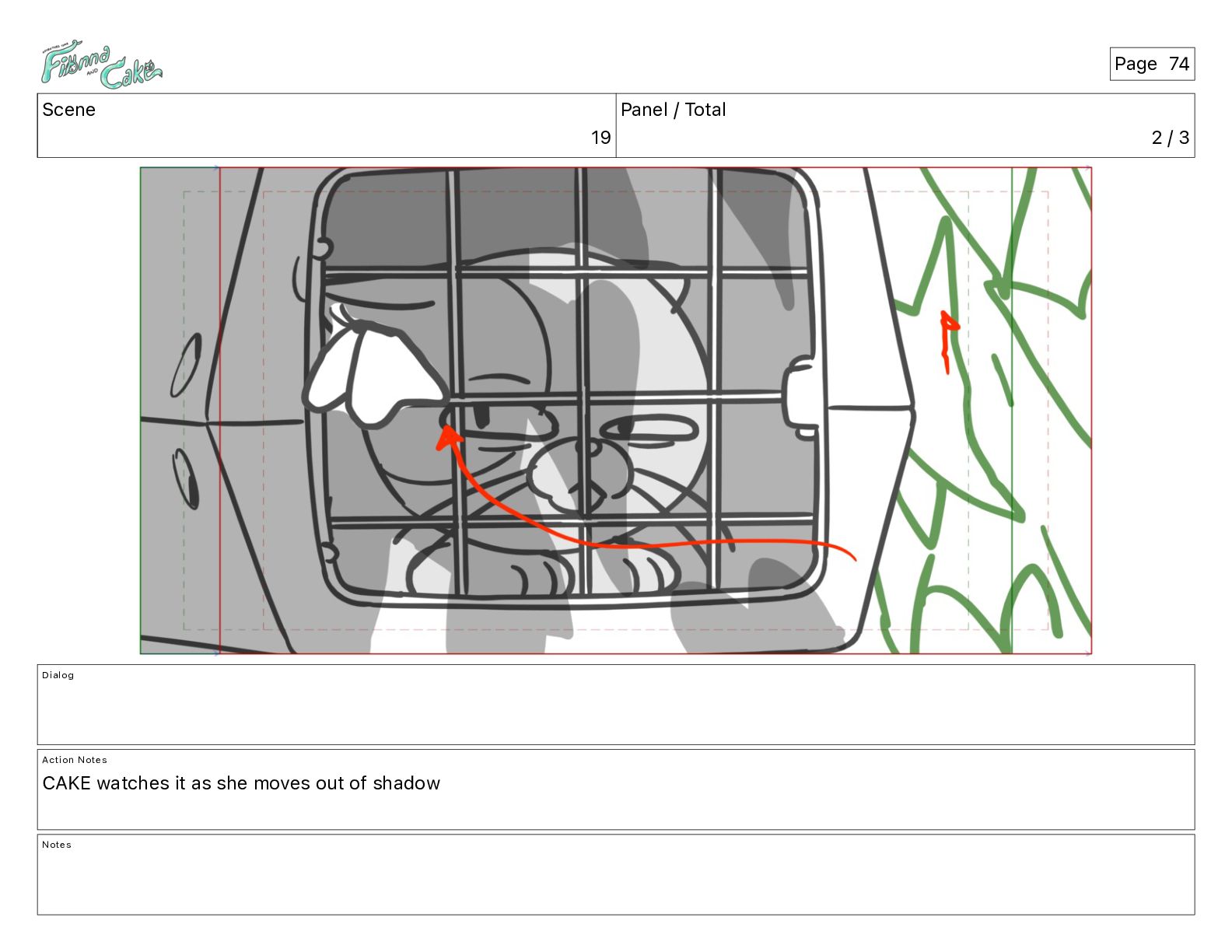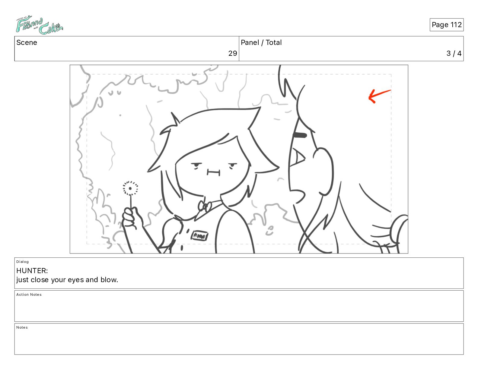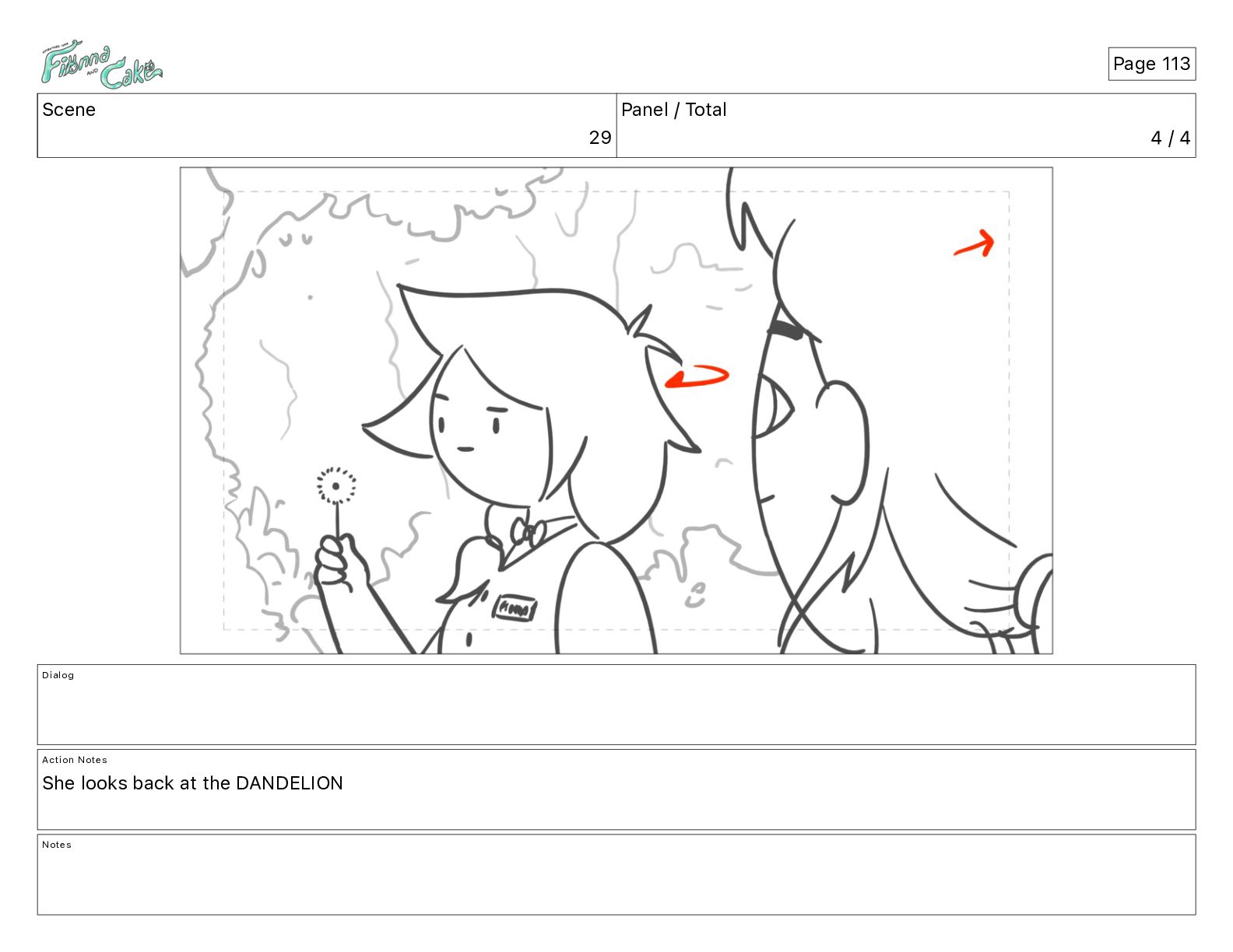 Argh! CAKE: <reow!> Action Notes STOP CAM ADJ FIONNA trips again Notes Page 29