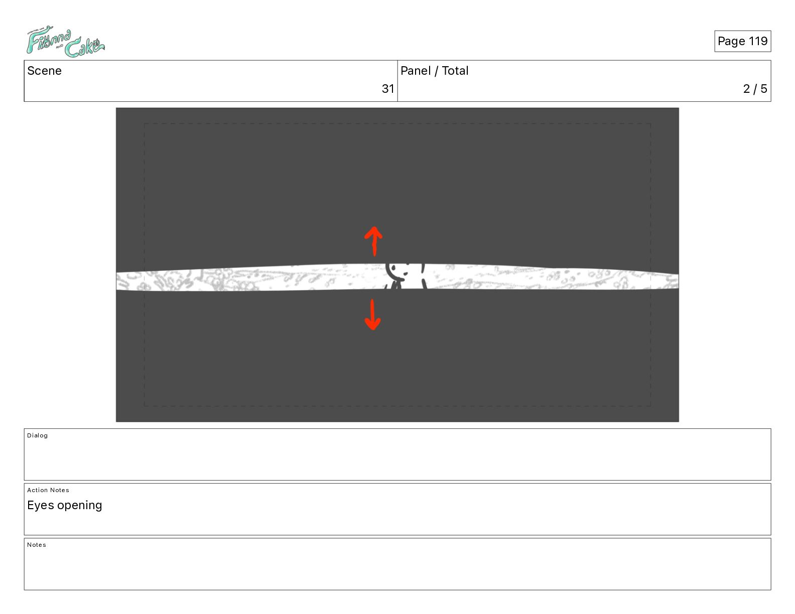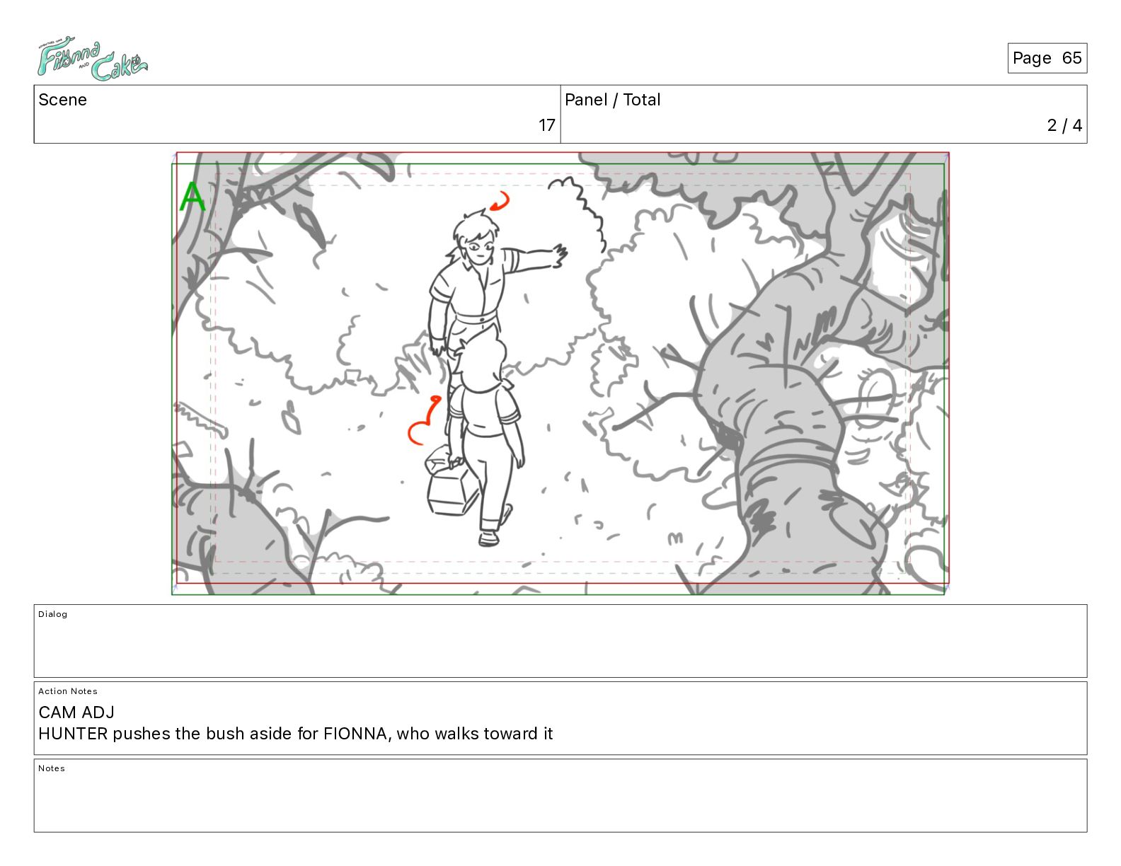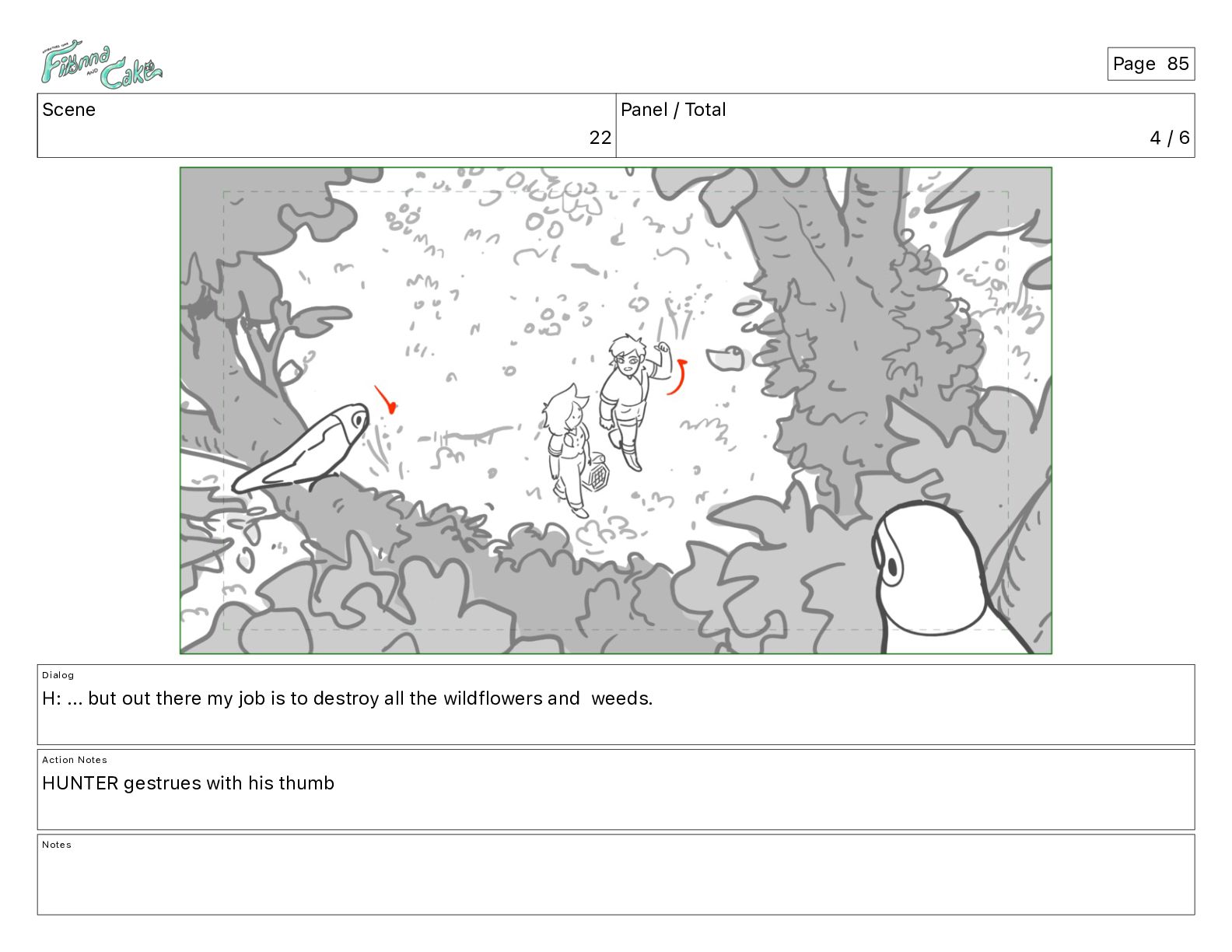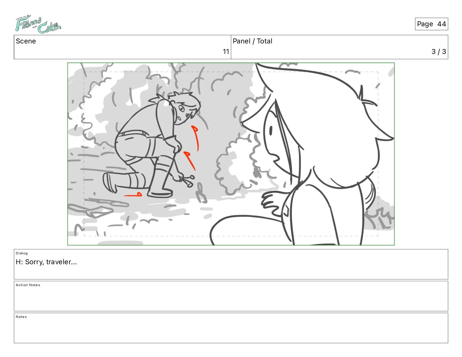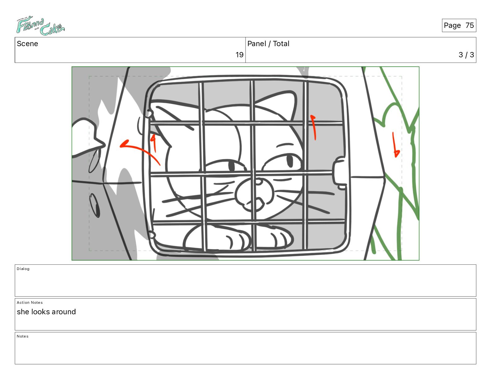 Argh! CAKE: <reow!> Action Notes STOP CAM ADJ FIONNA trips again Notes Page 29