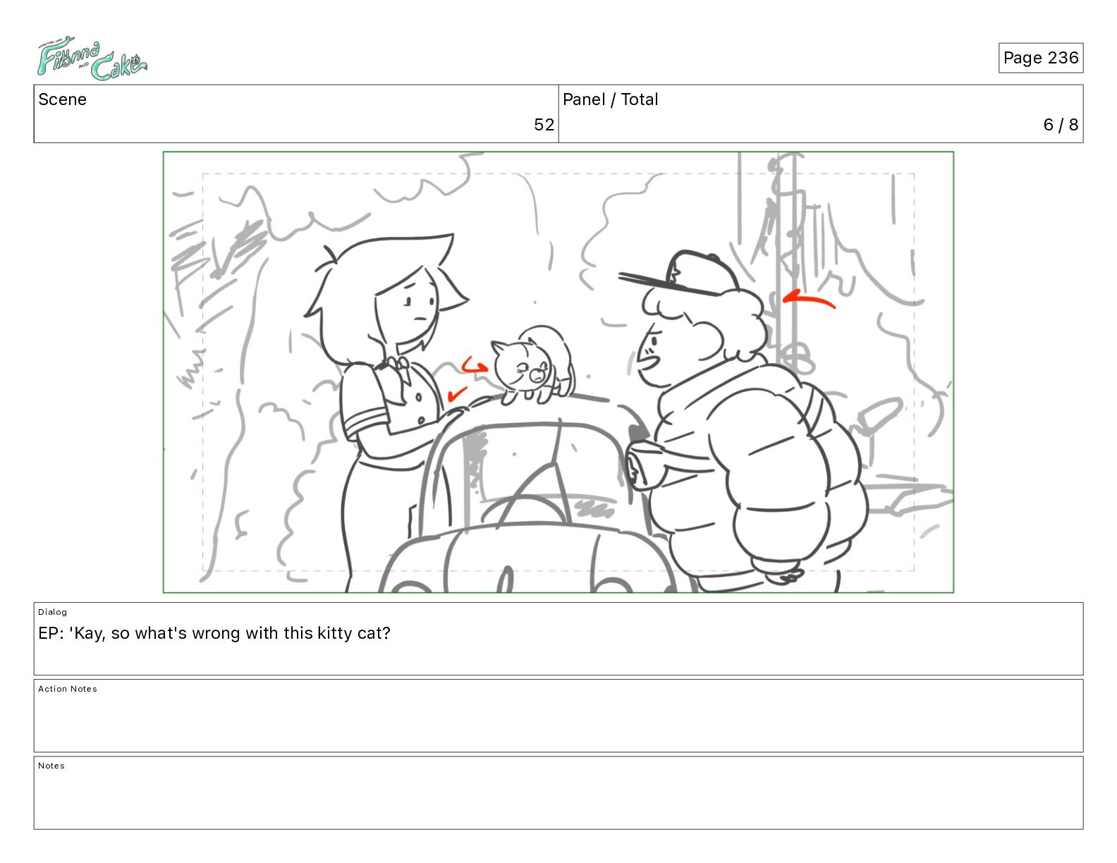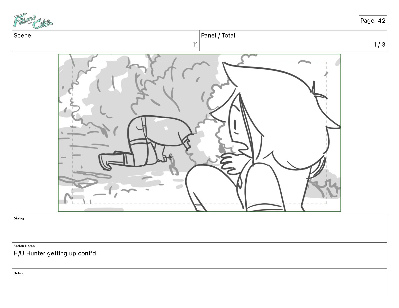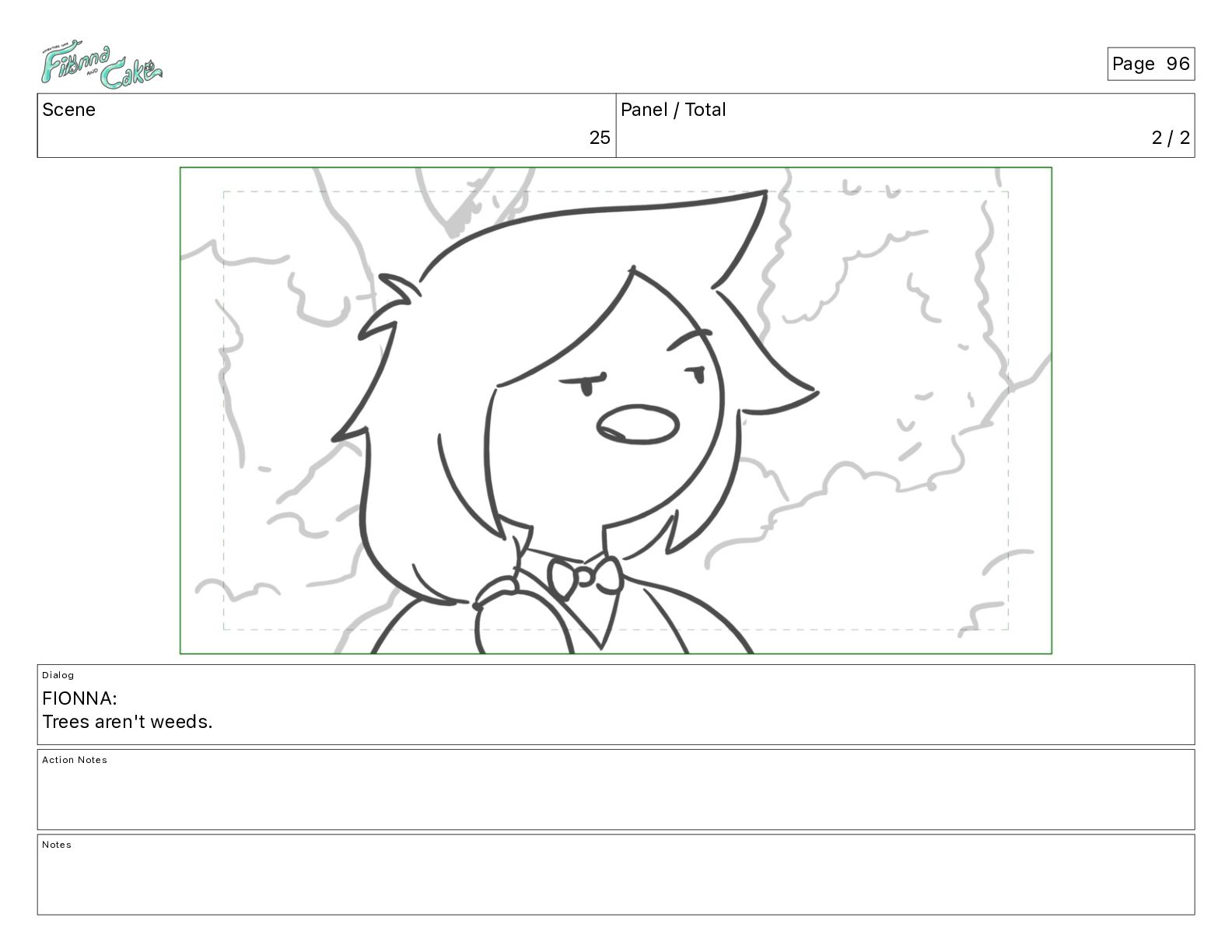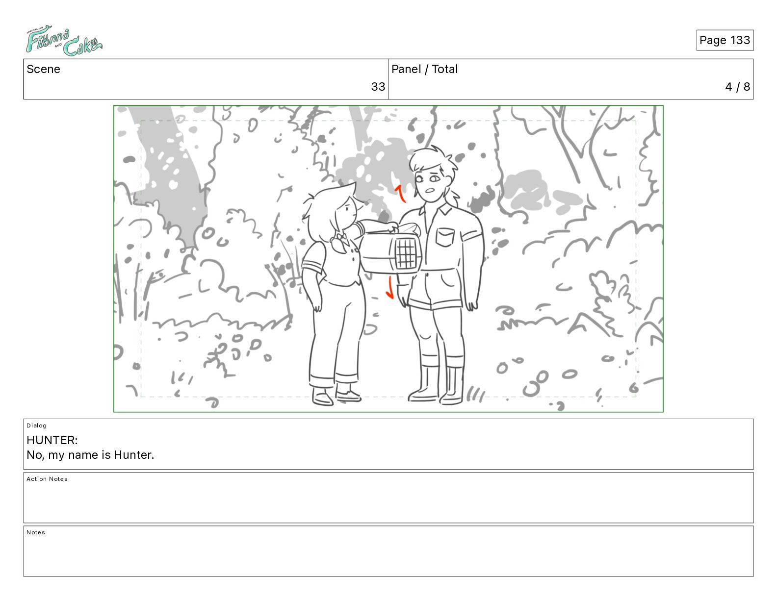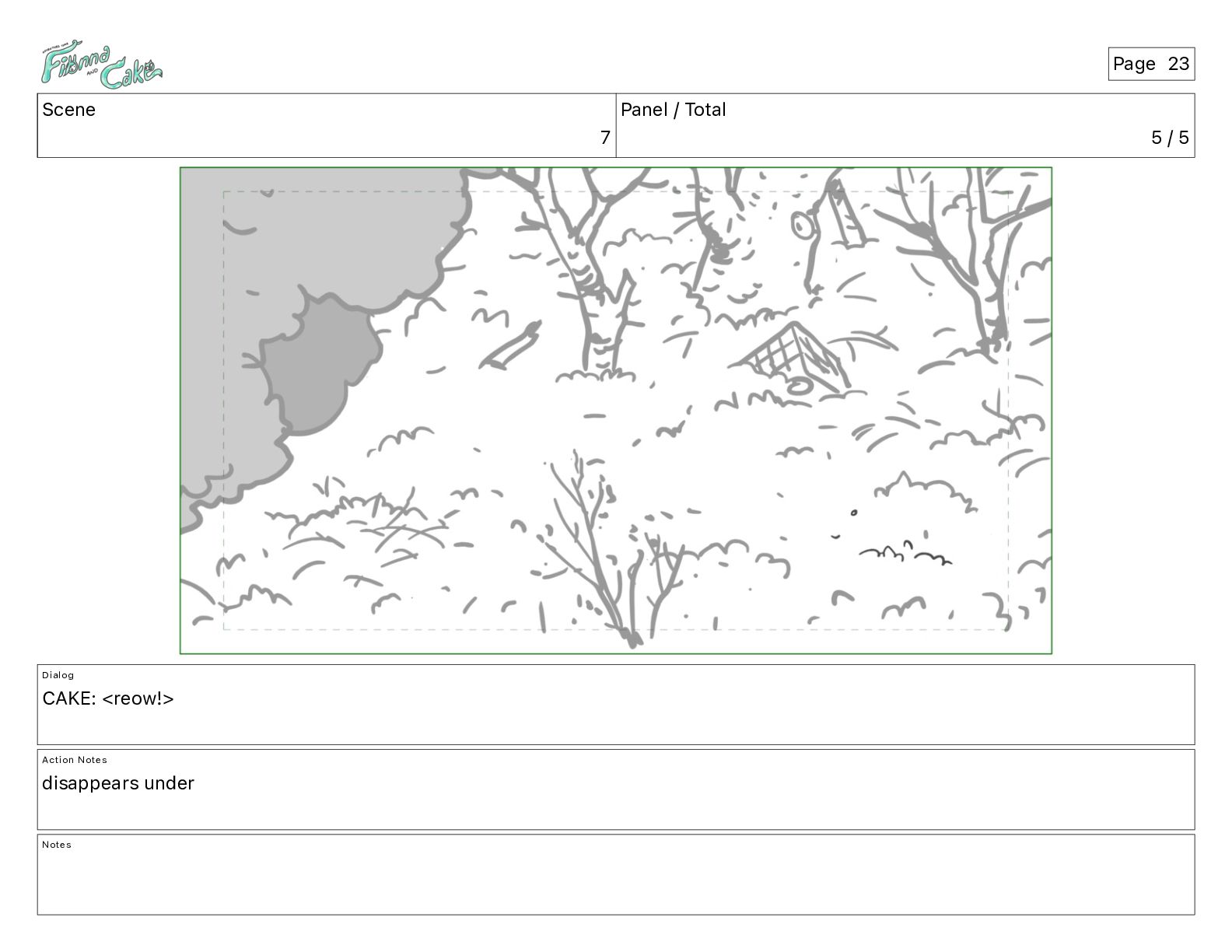Argh! CAKE: <reow!> Action Notes STOP CAM ADJ FIONNA trips again Notes Page 29