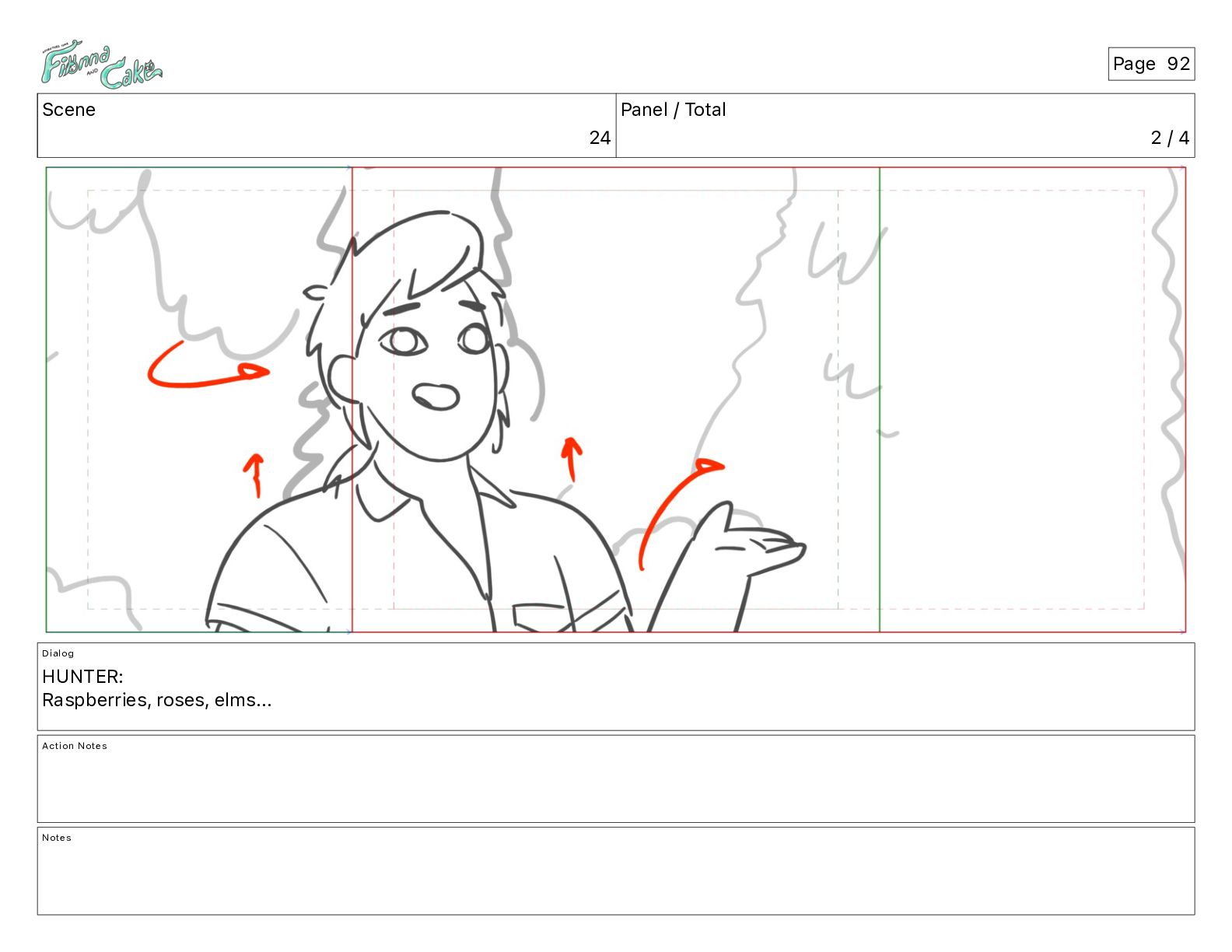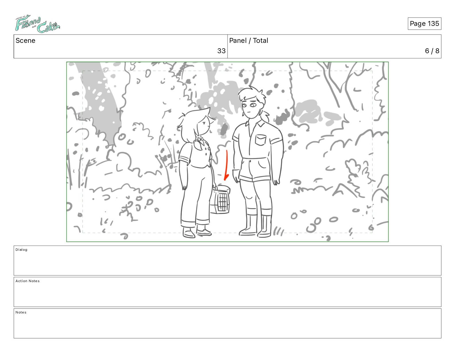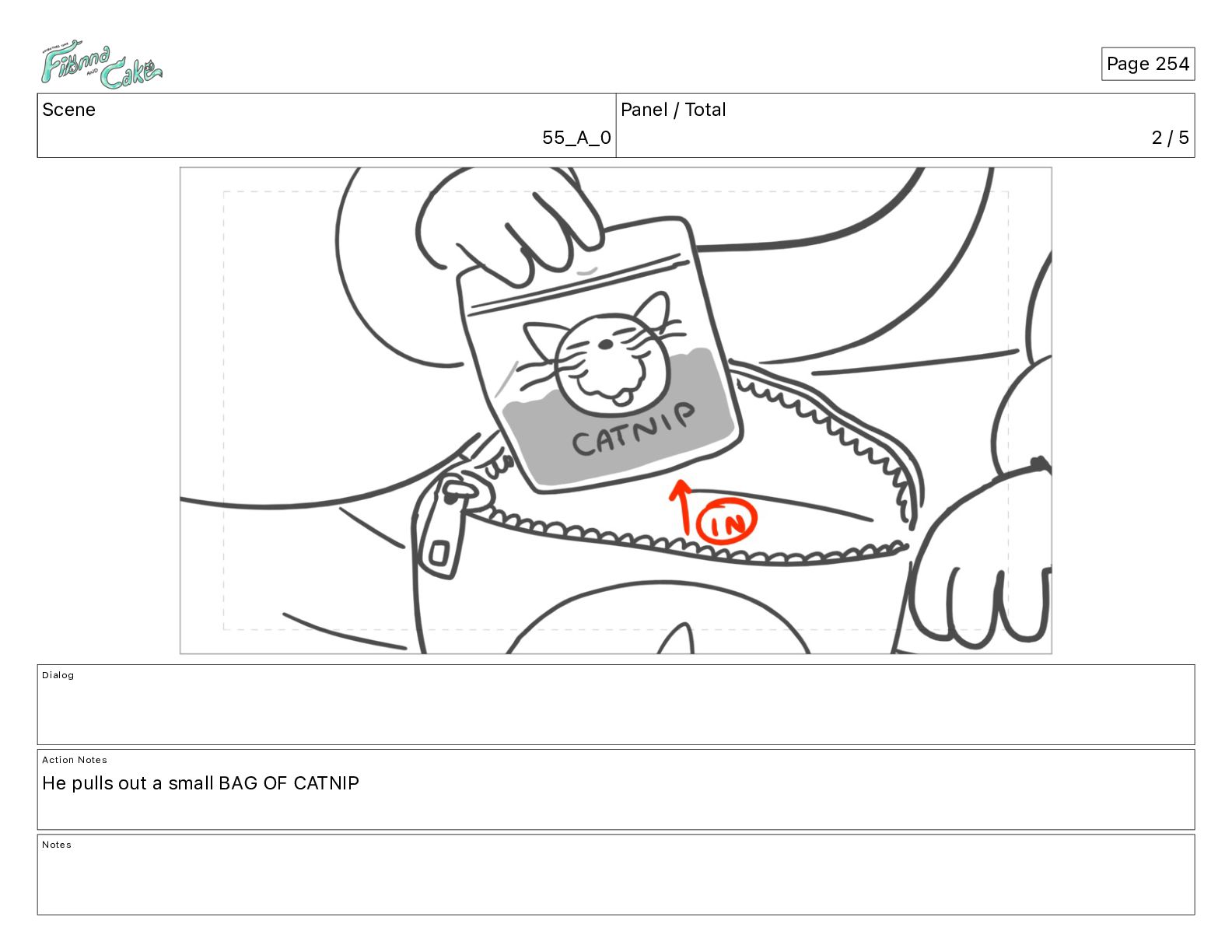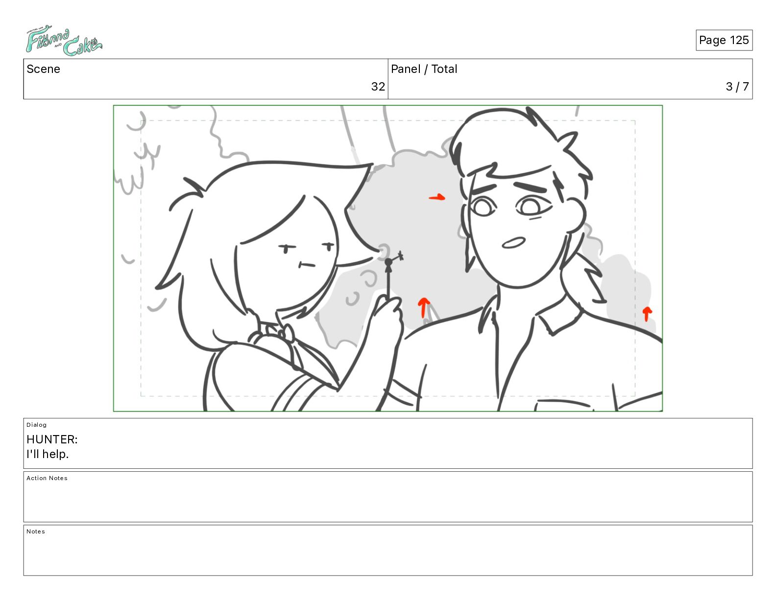 Argh! CAKE: <reow!> Action Notes STOP CAM ADJ FIONNA trips again Notes Page 29