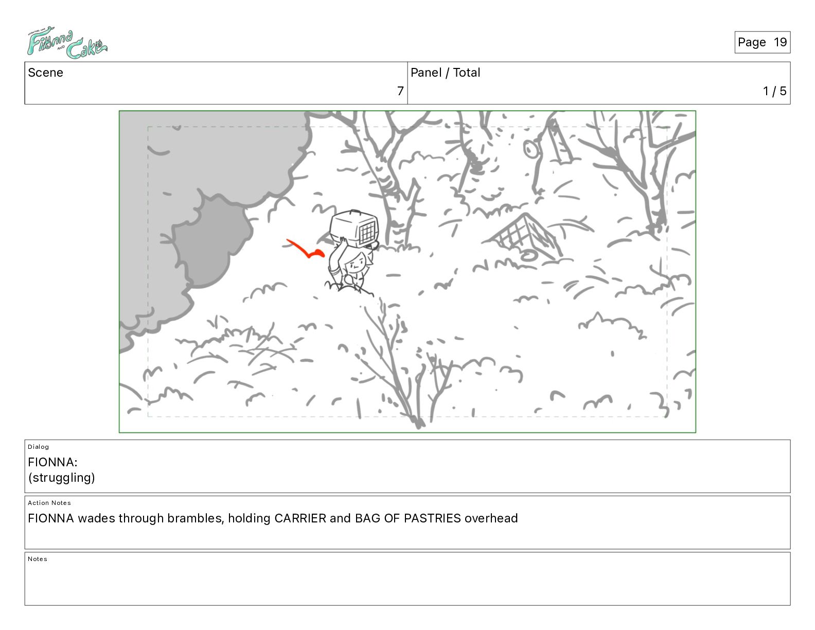 (struggling) Action Notes FIONNA wades through brambles, holding CARRIER and BAG OF PASTRIES overhead Notes Page 19