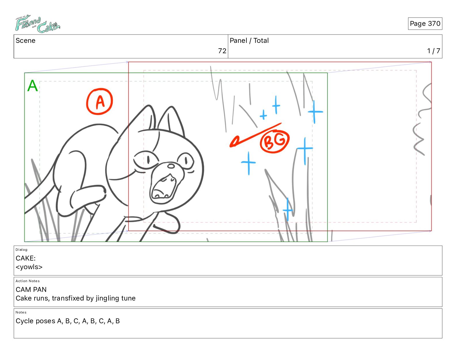 <yowls> Action Notes CAM PAN Cake runs, transfixed by jingling tune Notes Cycle poses A, B, C, A, B, C, A, B Page 370