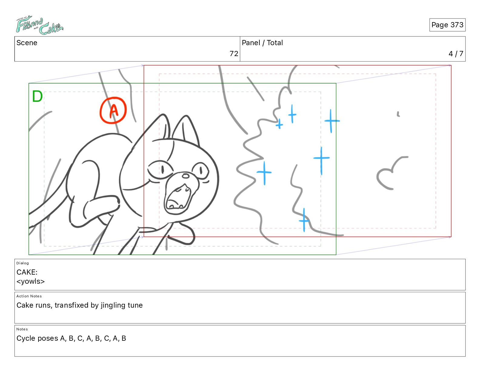 <yowls> Action Notes Cake runs, transfixed by jingling tune Notes Cycle poses A, B, C, A, B, C, A, B Page 373