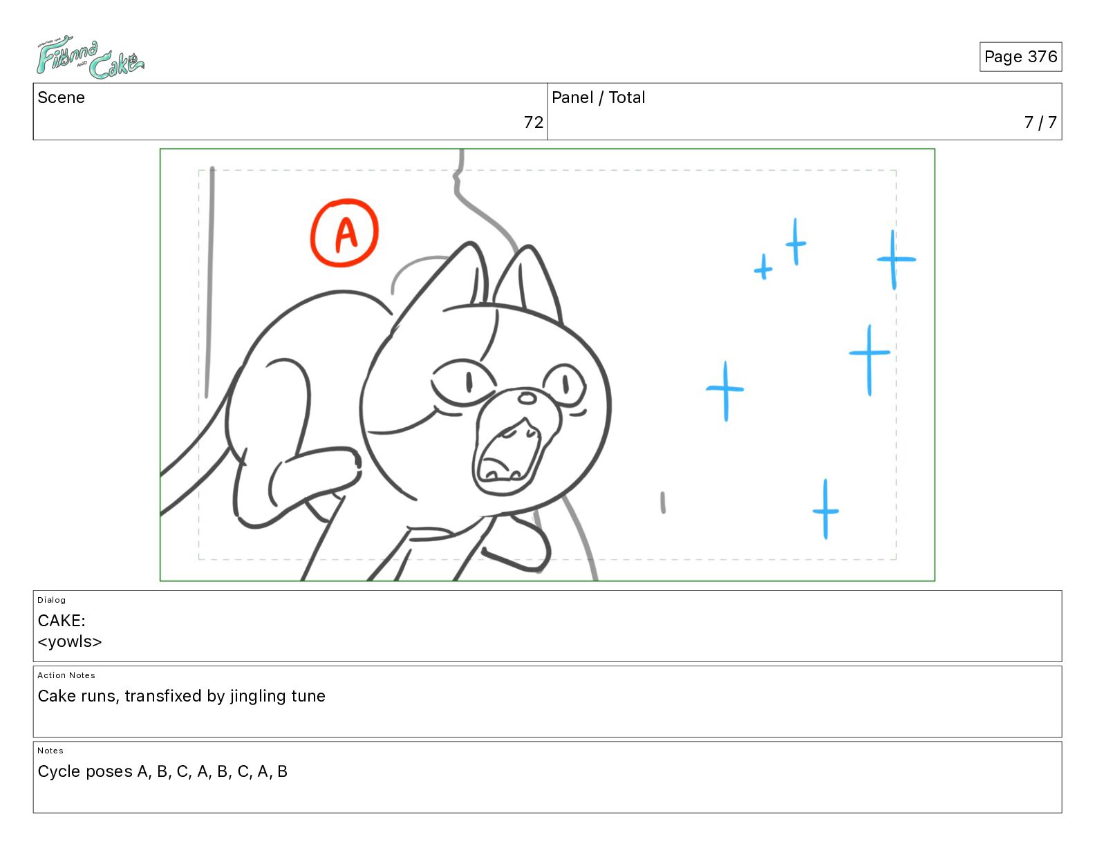 <yowls> Action Notes Cake runs, transfixed by jingling tune Notes Cycle poses A, B, C, A, B, C, A, B Page 376