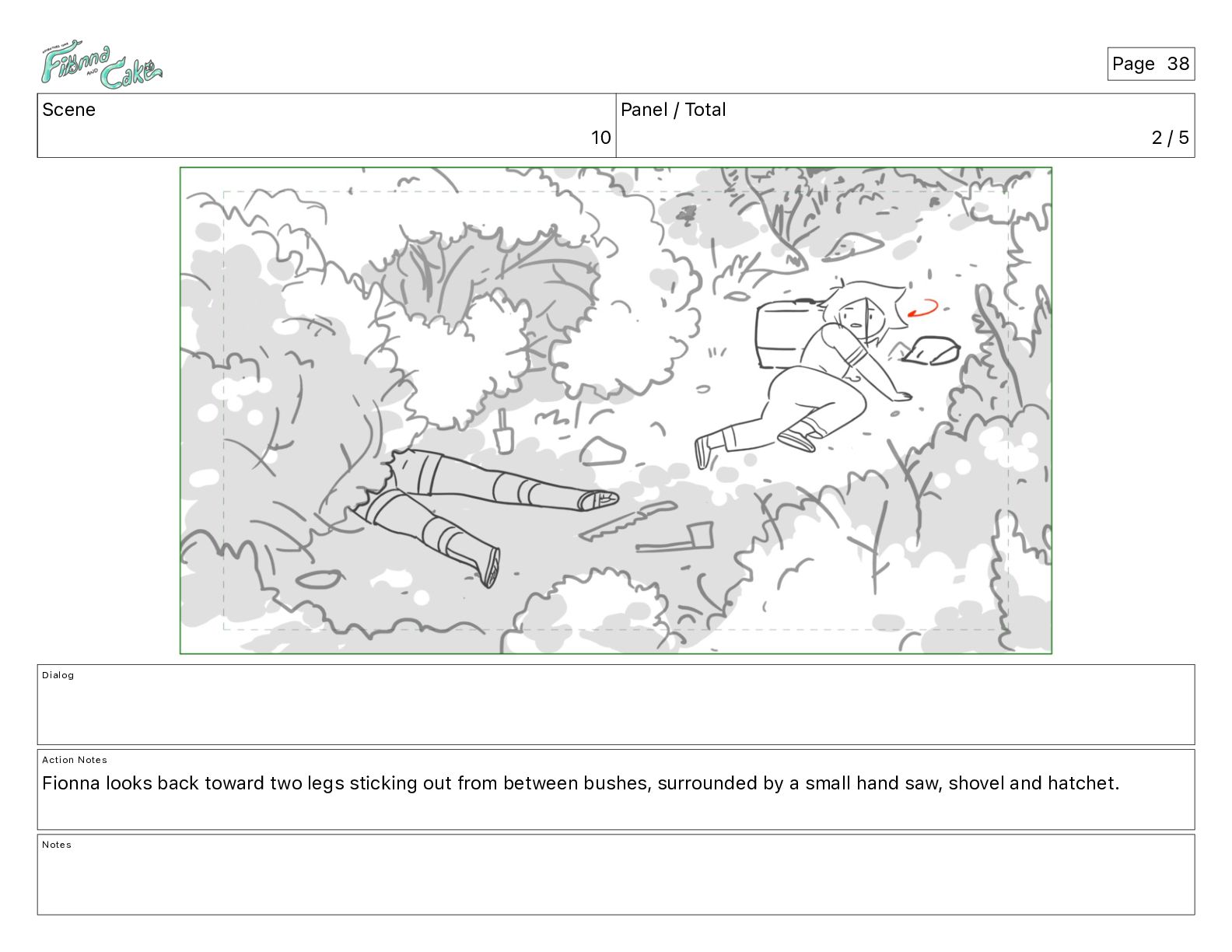 Notes Fionna looks back toward two legs sticking out from between bushes, surrounded by a small hand saw, shovel and hatchet. Notes Page 38