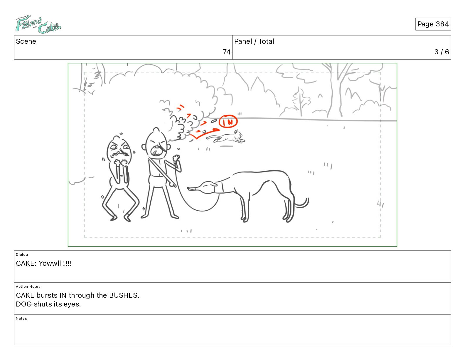 Yowwlll!!!! Action Notes CAKE bursts IN through the BUSHES. DOG shuts its eyes. Notes Page 384