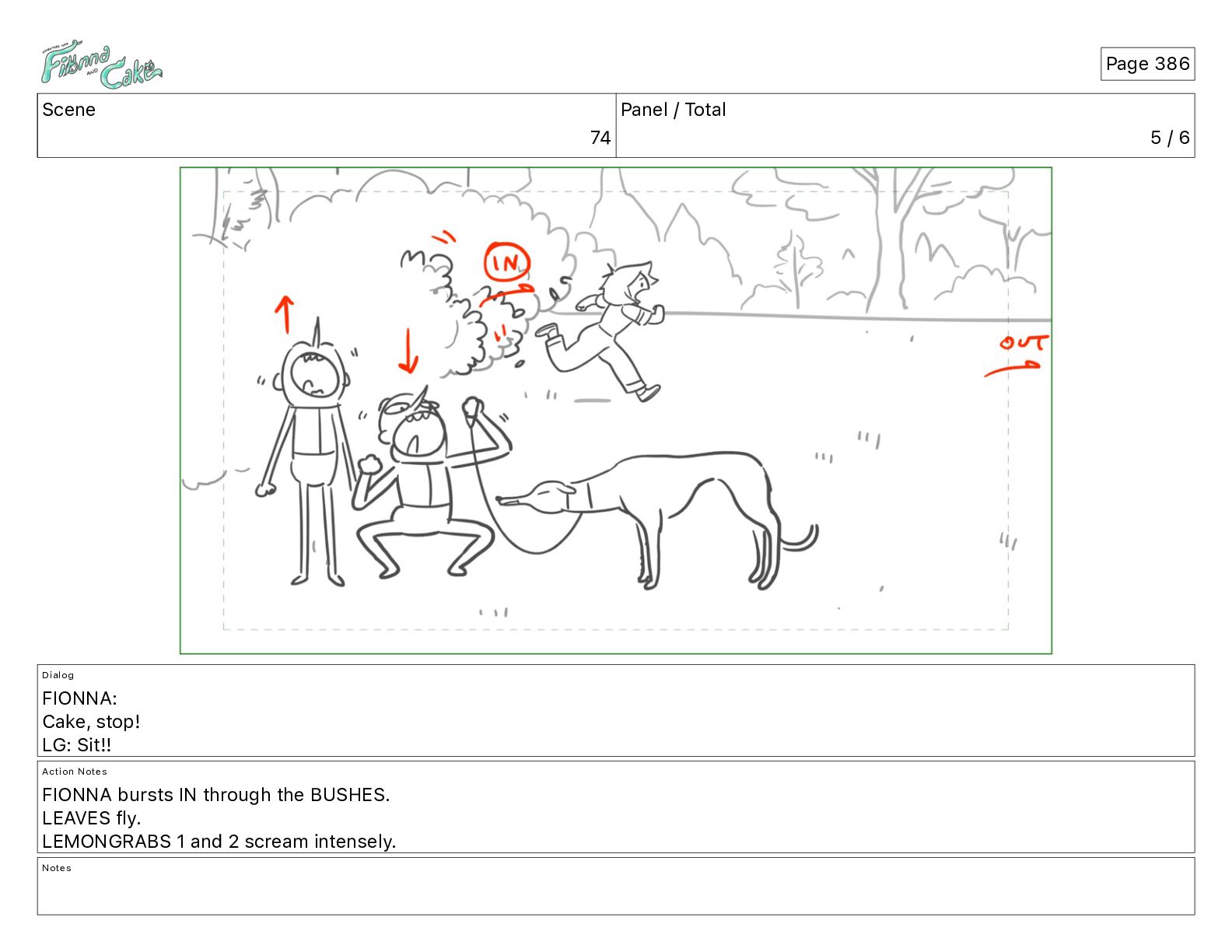 Cake, stop! LG: Sit!! Action Notes FIONNA bursts IN through the BUSHES. LEAVES fly. LEMONGRABS 1 and 2 scream intensely. Notes Page 386