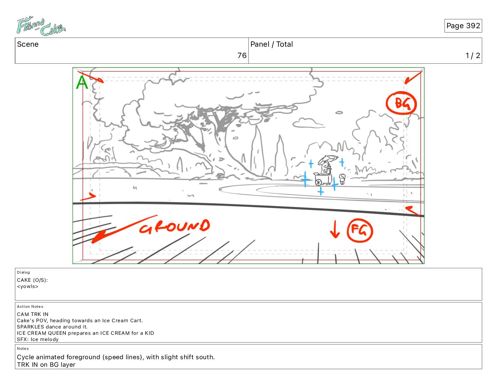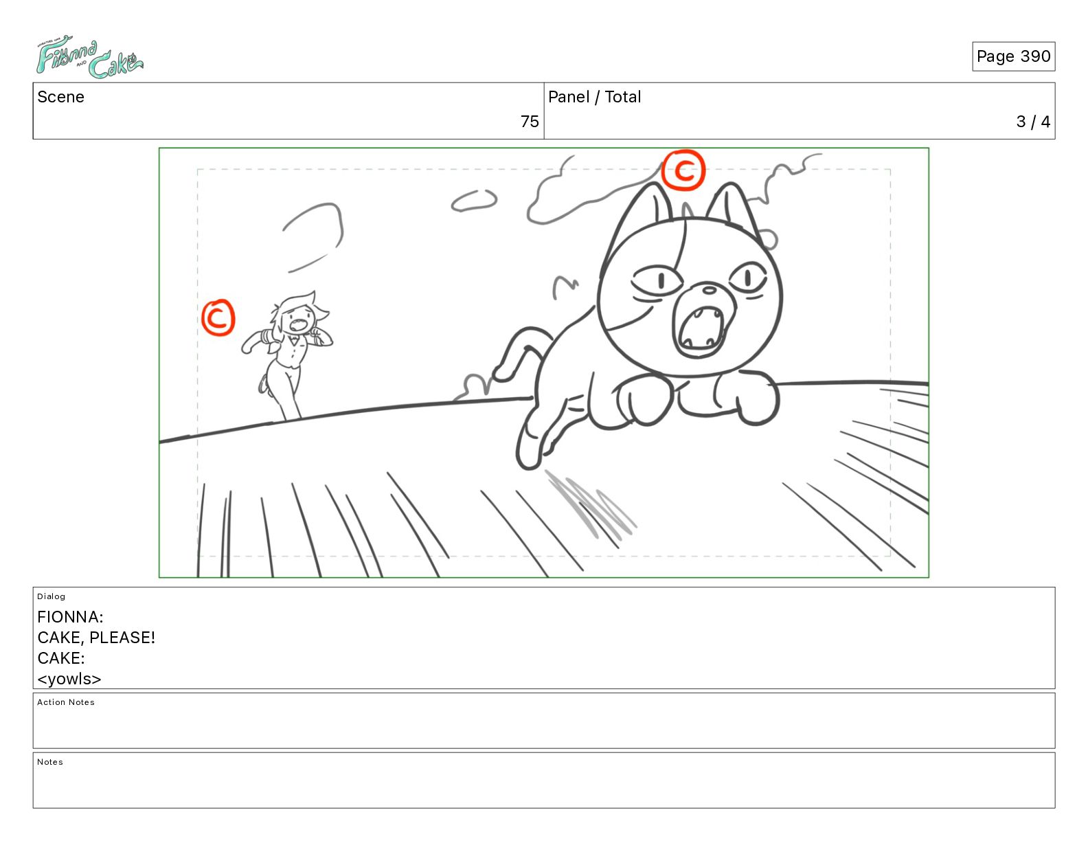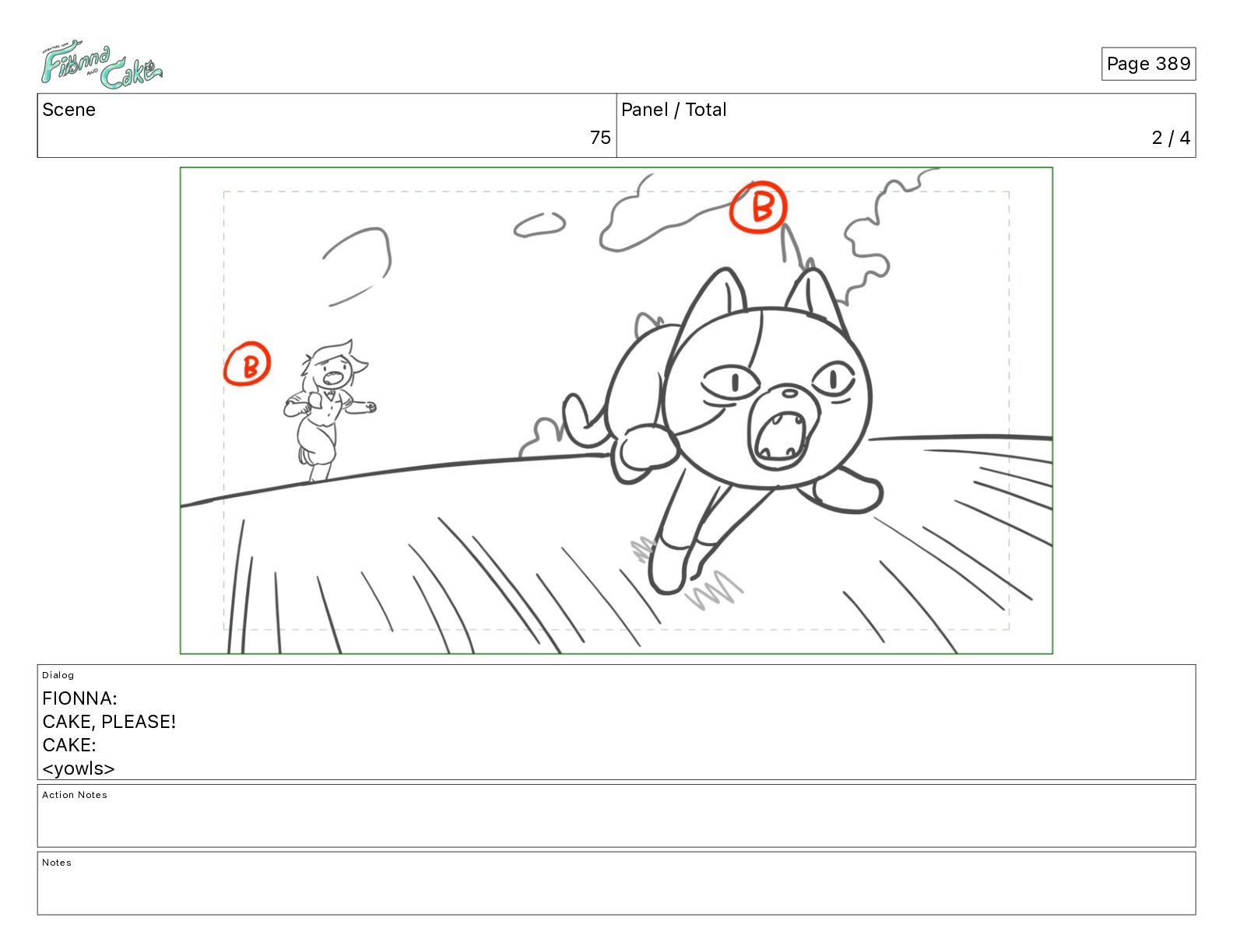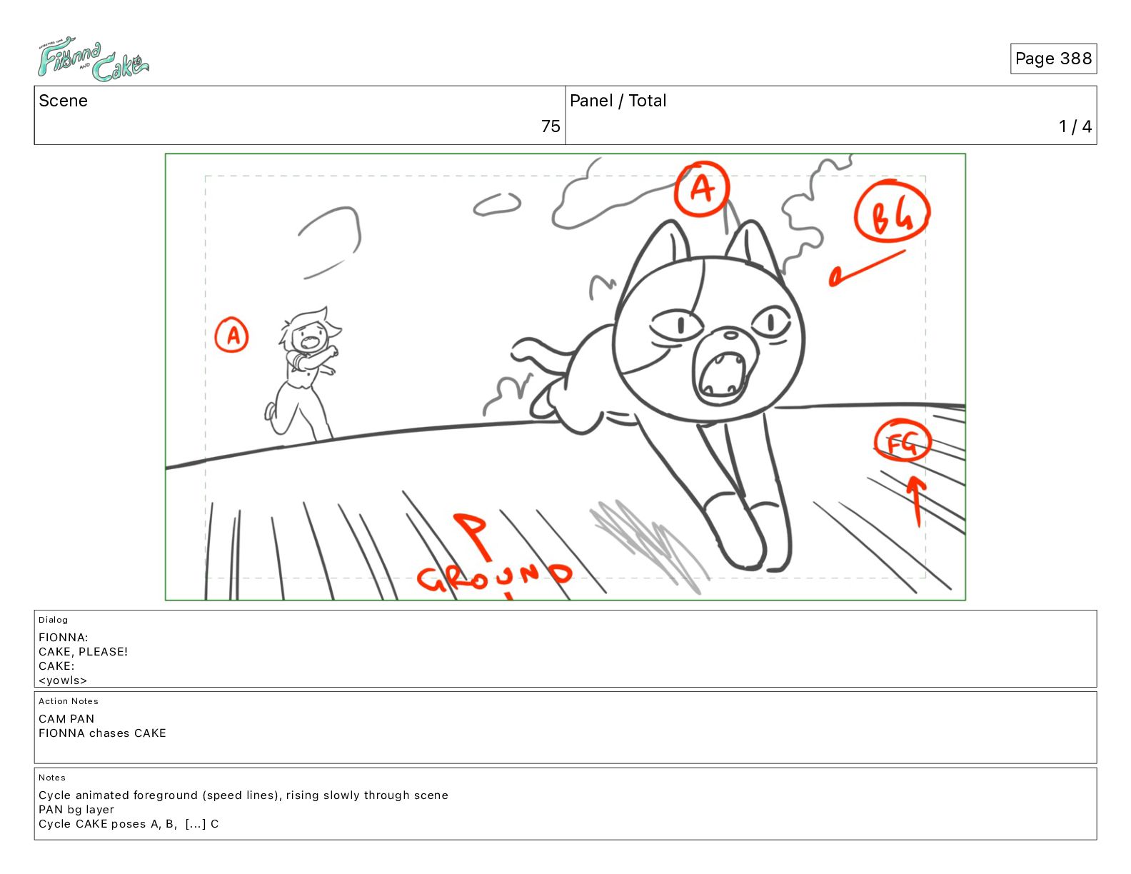 CAKE, PLEASE! CAKE: <yowls> Action Notes CAM PAN FIONNA chases CAKE Notes Cycle animated foreground (speed lines), rising slowly through scene PAN bg layer Cycle CAKE poses A, B, [...] C Page 388