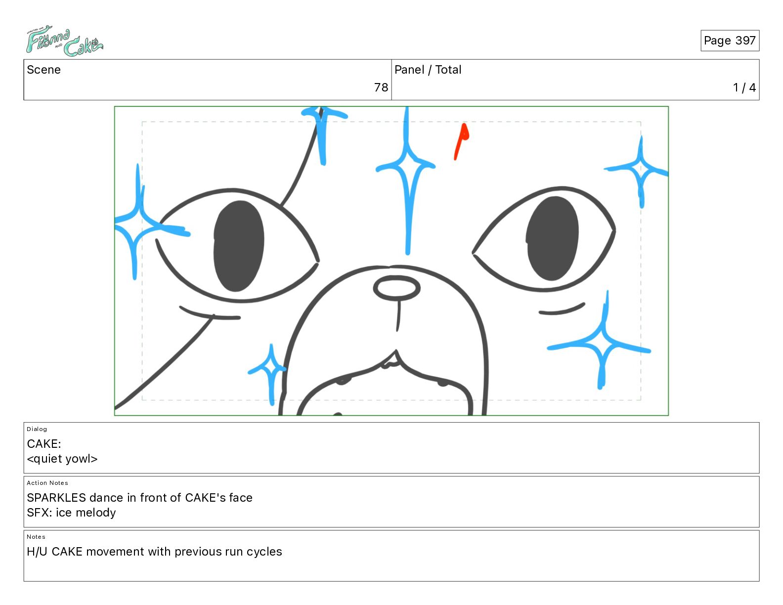 <quiet yowl> Action Notes SPARKLES dance in front of CAKE's face SFX: ice melody Notes H/U CAKE movement with previous run cycles Page 397