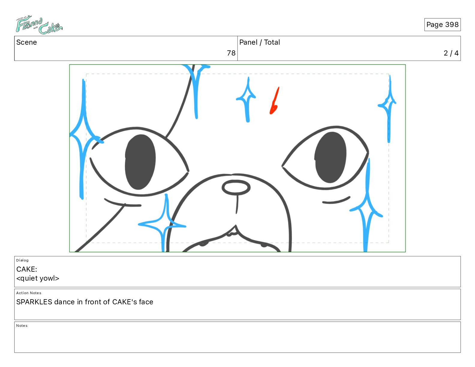 <quiet yowl> Action Notes SPARKLES dance in front of CAKE's face Notes Page 398