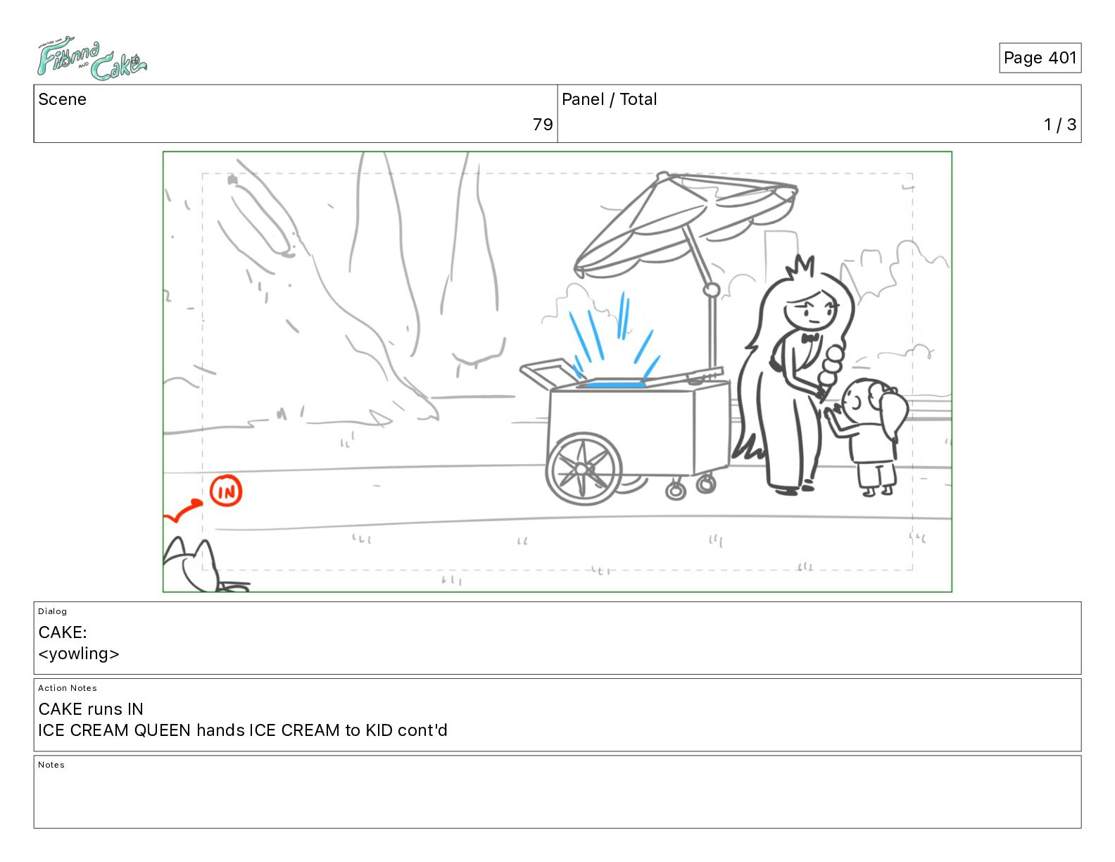 <yowling> Action Notes CAKE runs IN ICE CREAM QUEEN hands ICE CREAM to KID cont'd Notes Page 401