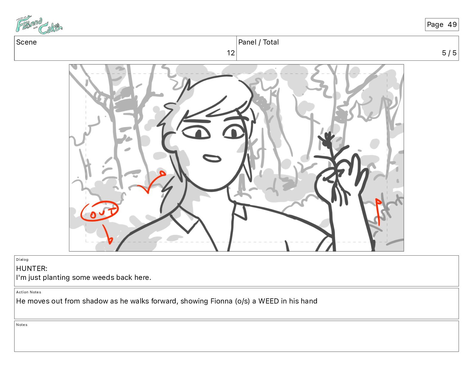 I'm just planting some weeds back here. Action Notes He moves out from shadow as he walks forward, showing Fionna (o/s) a WEED in his hand Notes Page 49