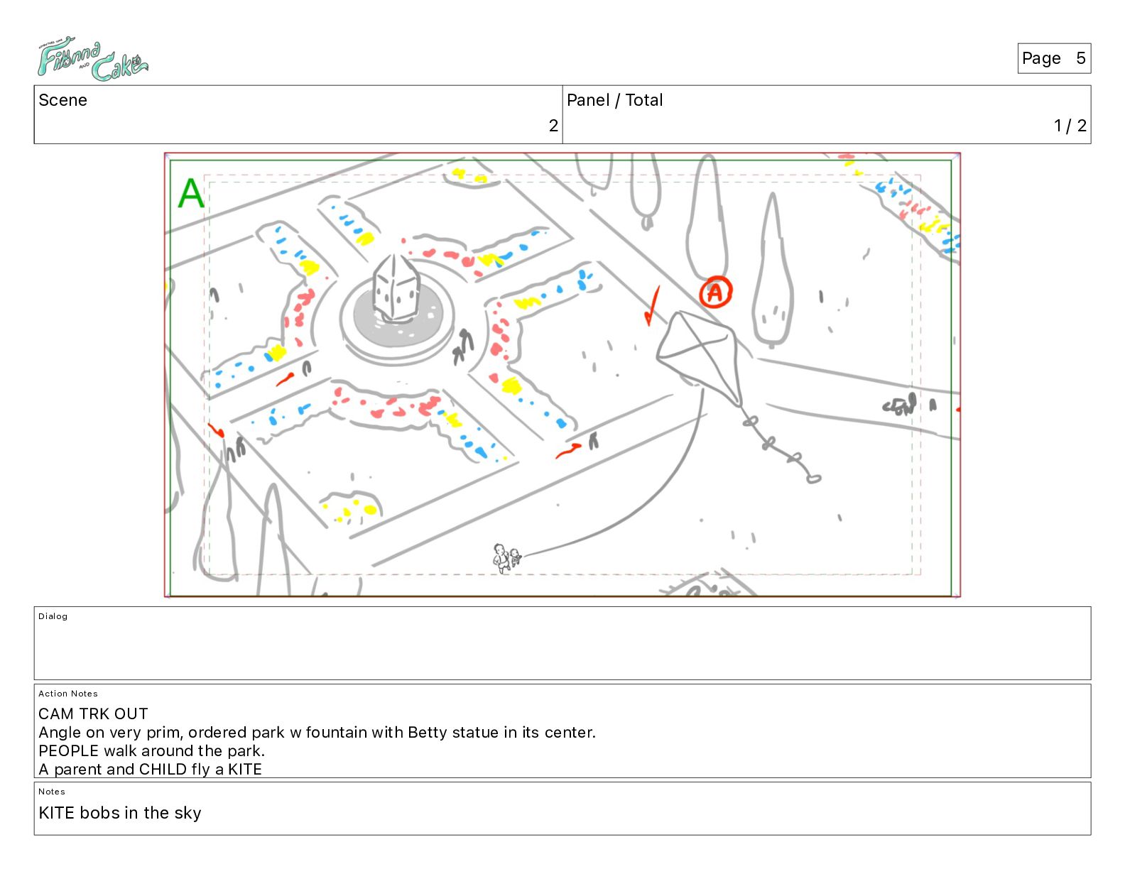 Notes CAM TRK OUT Angle on very prim, ordered park w fountain with Betty statue in its center. PEOPLE walk around the park. A parent and CHILD fly a KITE Notes KITE bobs in the sky Page 5