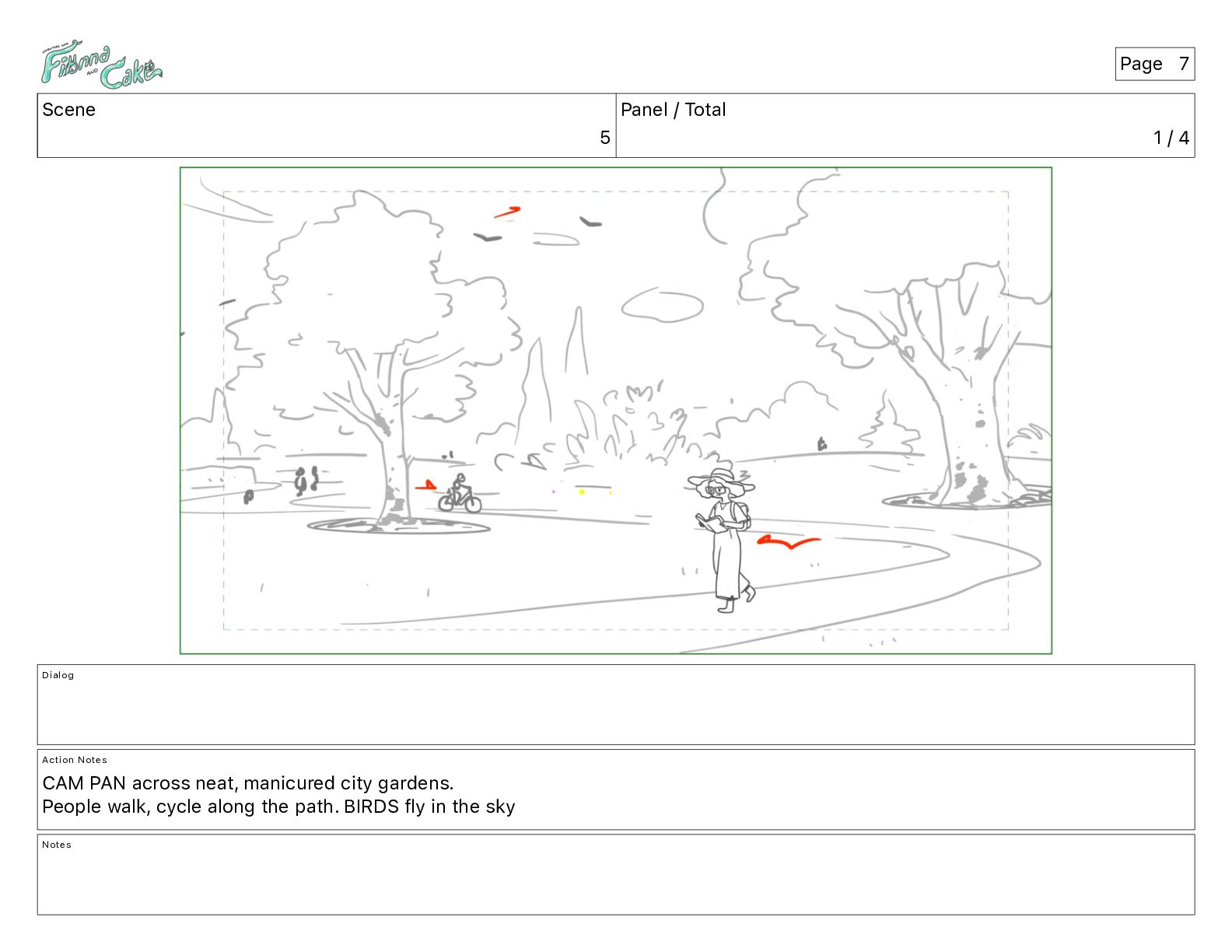 Notes CAM PAN across neat, manicured city gardens. People walk, cycle along the path. BIRDS fly in the sky Notes Page 7