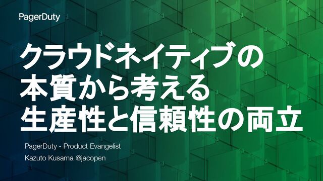 クラウドネイティブの 本質から考える 生産性と信頼性の両立 PagerDuty - Product Evangelist Kazuto Kusama @jacopen
