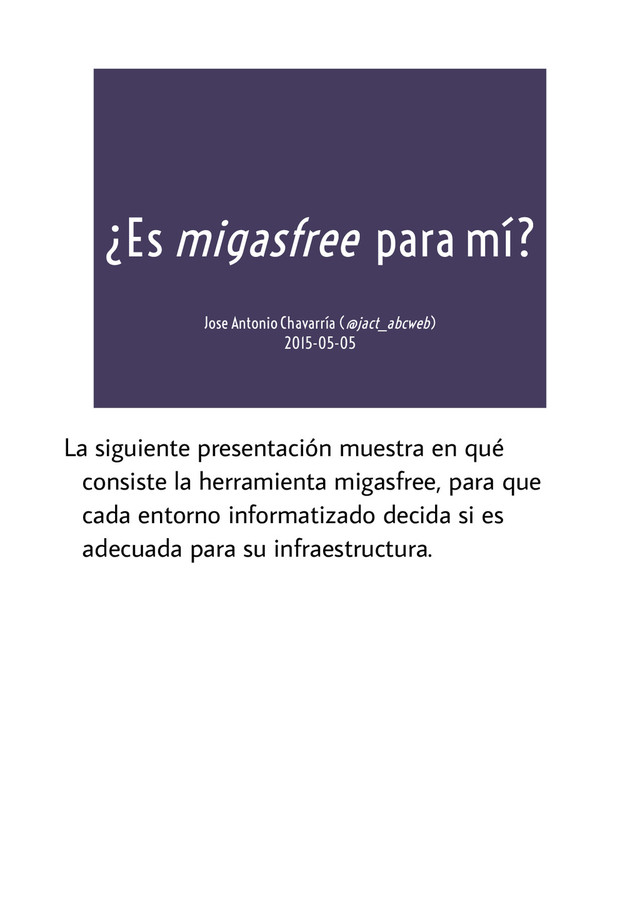 La siguiente presentación muestra en qué consiste la herramienta migasfree, para que cada entorno informatizado decida si es adecuada para su infraestructura.