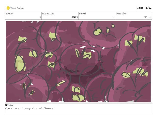 Scene 1 Duration 08:00 Panel 1 Duration 04:01 Notes Opens